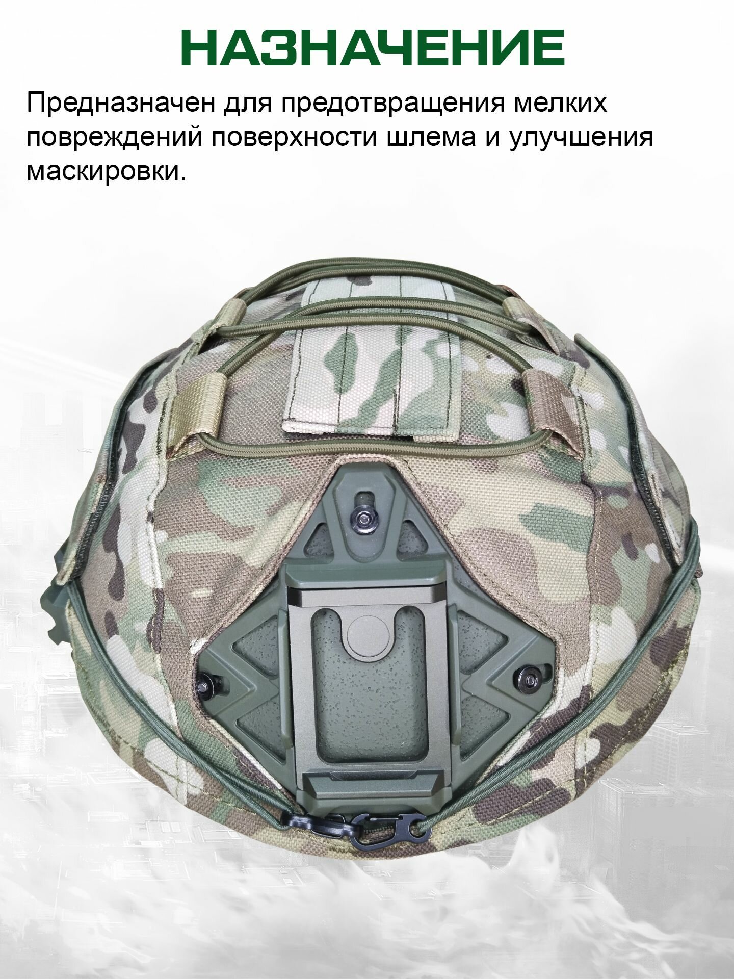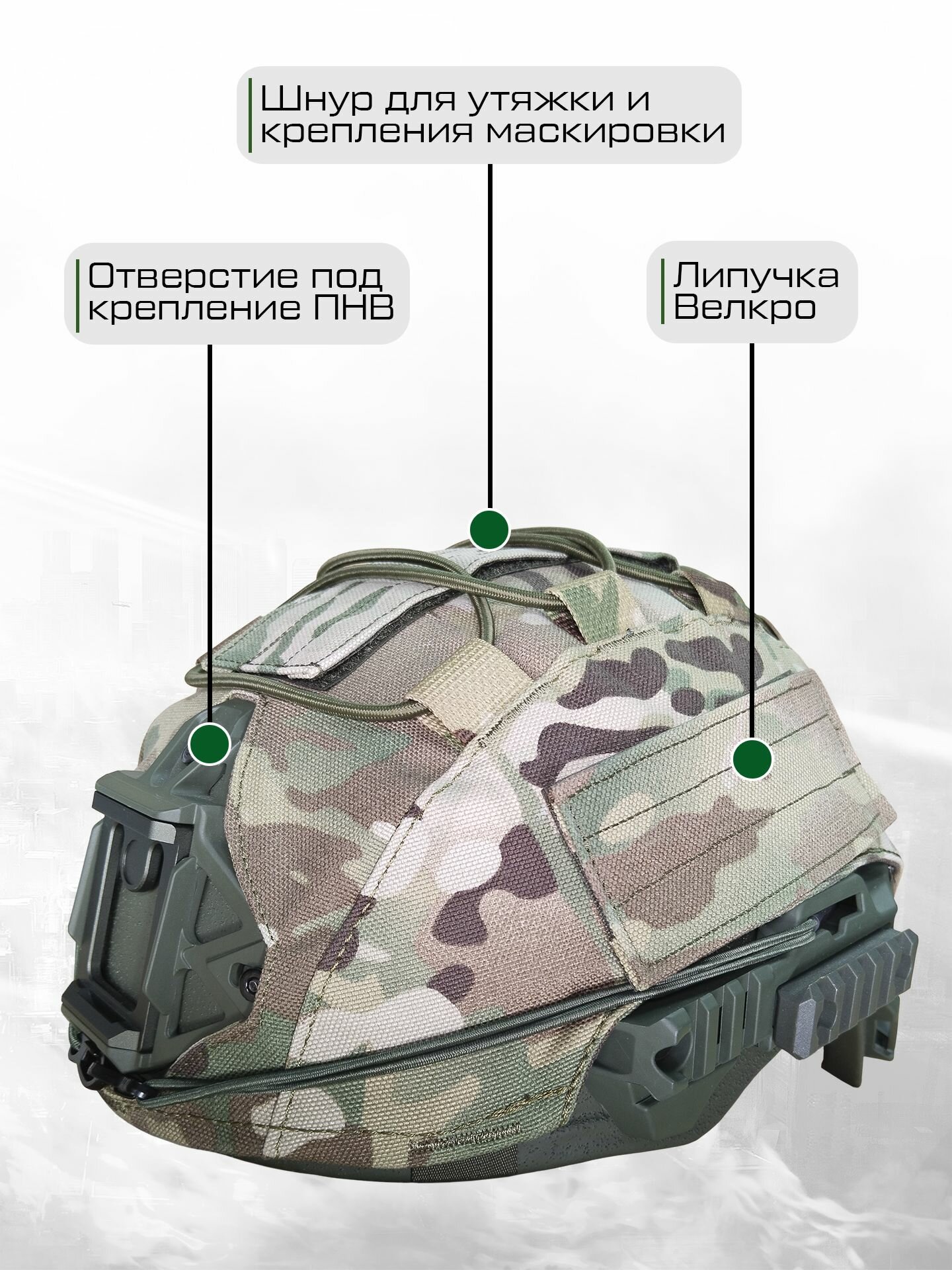 Чехол садится точно по шлему и плотно облегает его, есть отверстие под крепление ПНВ, расположенное на шлеме.