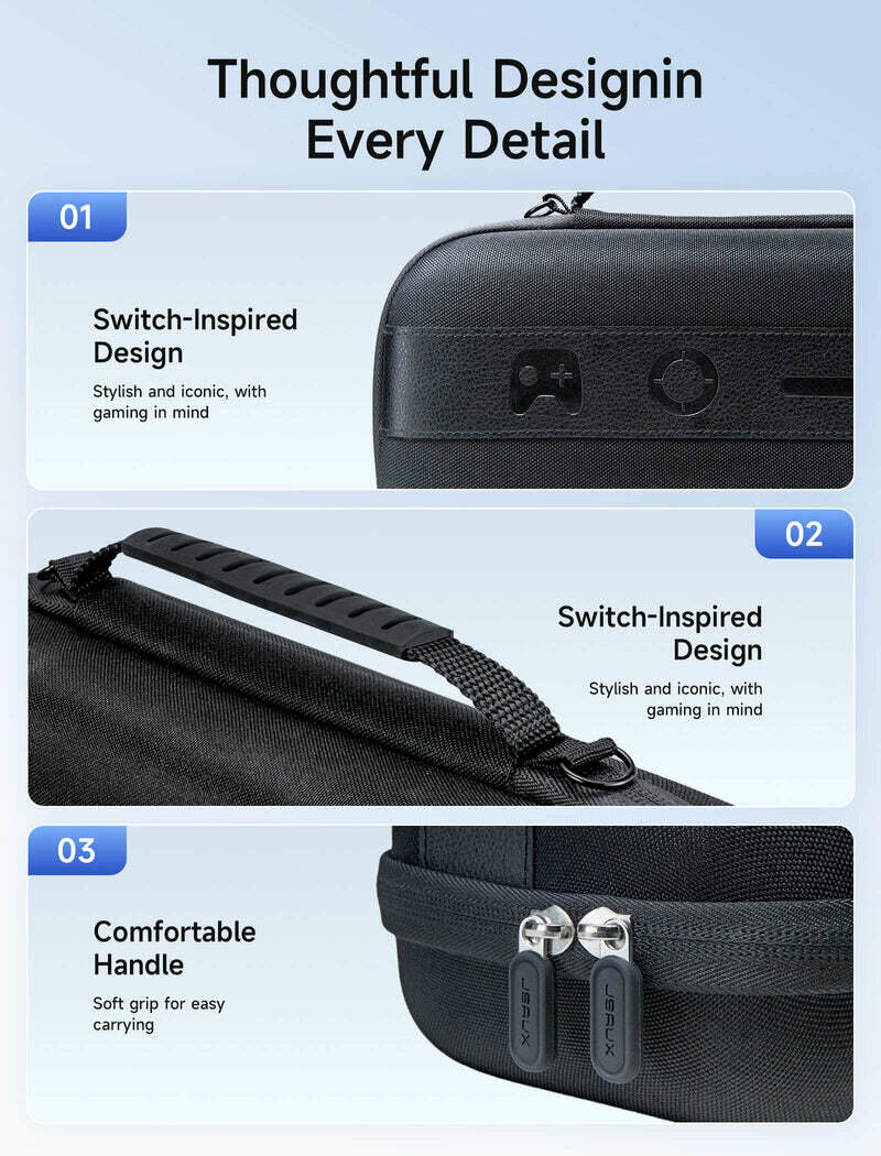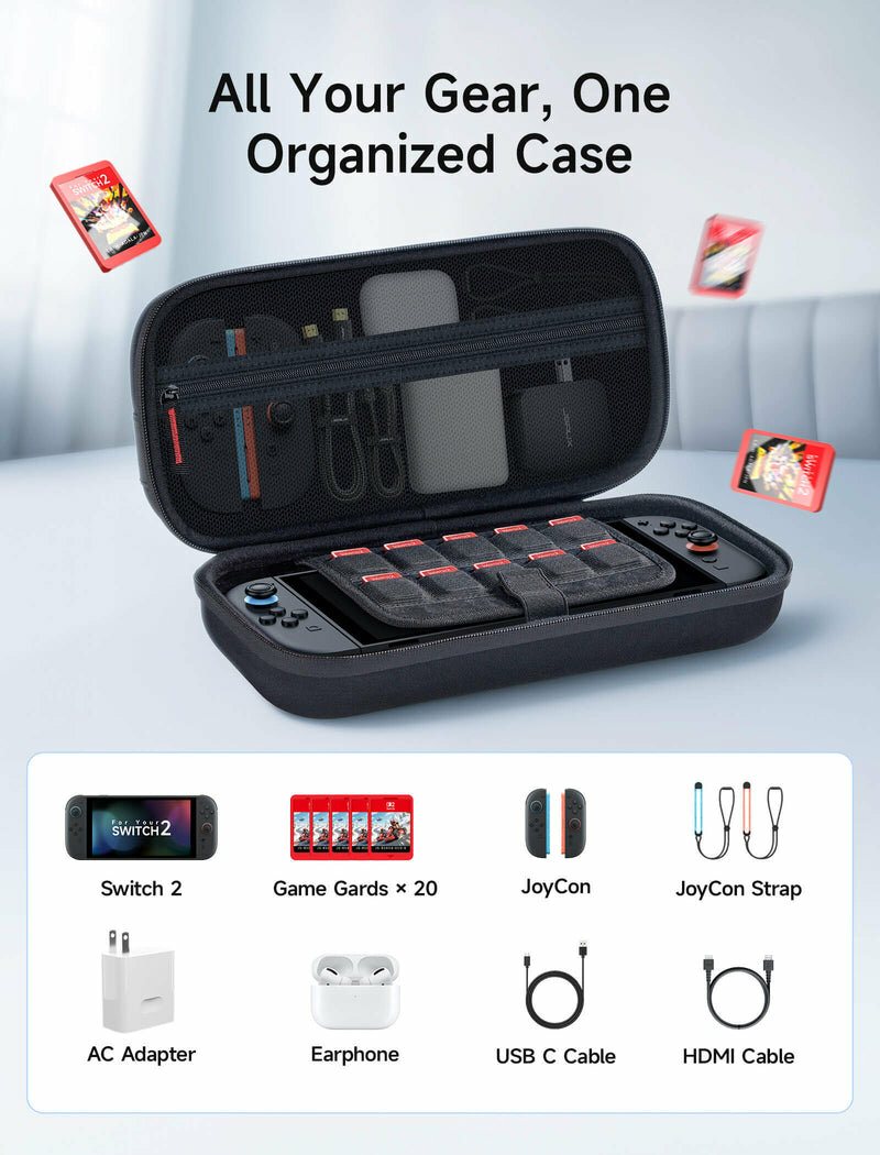 Чехол JSAUX MegaCarry для Nintendo Switch 2 (2025) — идеальное решение для хранения и транспортировки вашей консоли и всех необходимых аксессуаров. Этот вместительный дорожный чехол с твердым корпусом обеспечивает превосходную защиту и удобство в путешествиях.