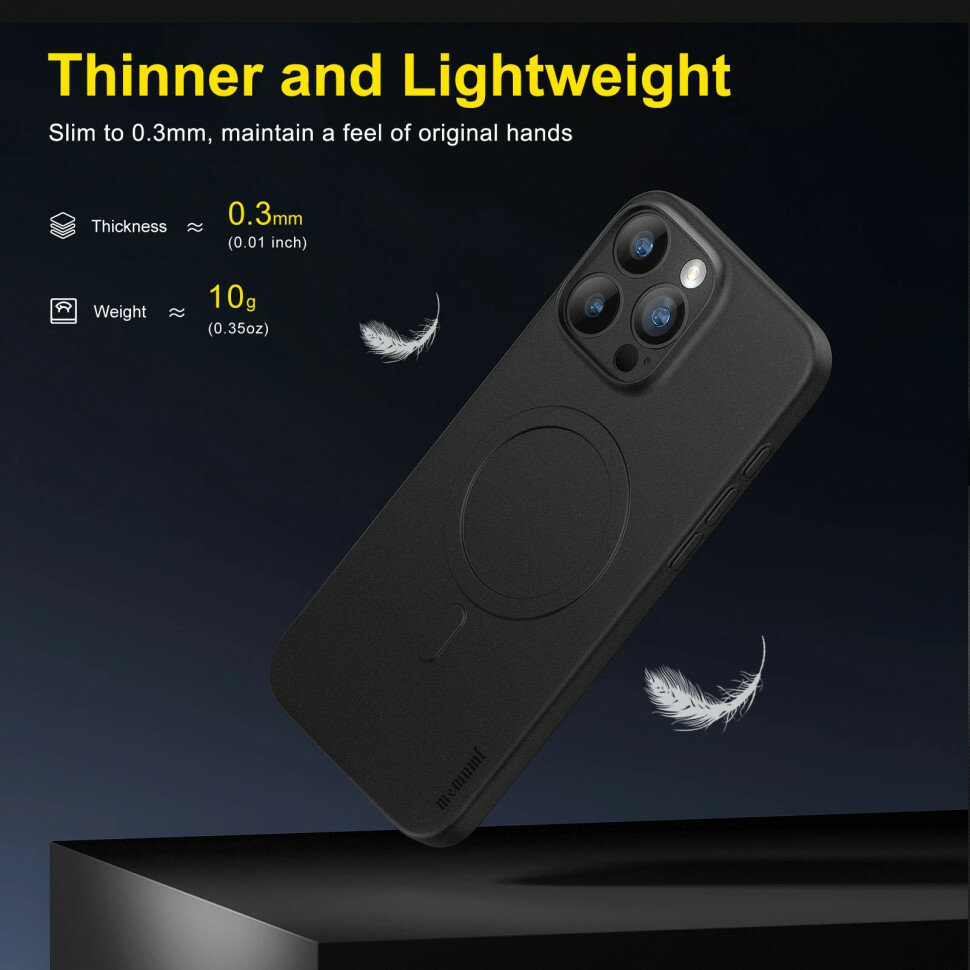 Чехол Memumi Ultra Slim 0.3 мм с MagSafe для iPhone Этот ультратонкий и лёгкий чехол толщиной всего 0,3 мм и весом около 10 г сохранит оригинальные ощущения от вашего устройства. Благодаря матовой текстуре, созданной методом пескоструйной обработки, чехол обеспечивает приятное тактильное ощущение и эффект "голого устройства", а также не оставляет отпечатков пальцев. Встроенный мощный магнит позволяет надежно использовать аксессуары.