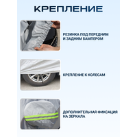 Чехол не только защищает кузов автомобиля, но и помогает сохранить его первоначальный вид. Независимо от времени года, он обеспечивает защиту от солнечных лучей, предотвращая выгорание лакокрасочного покрытия. В зимний период предотвращает образование льда и снега на стеклах.