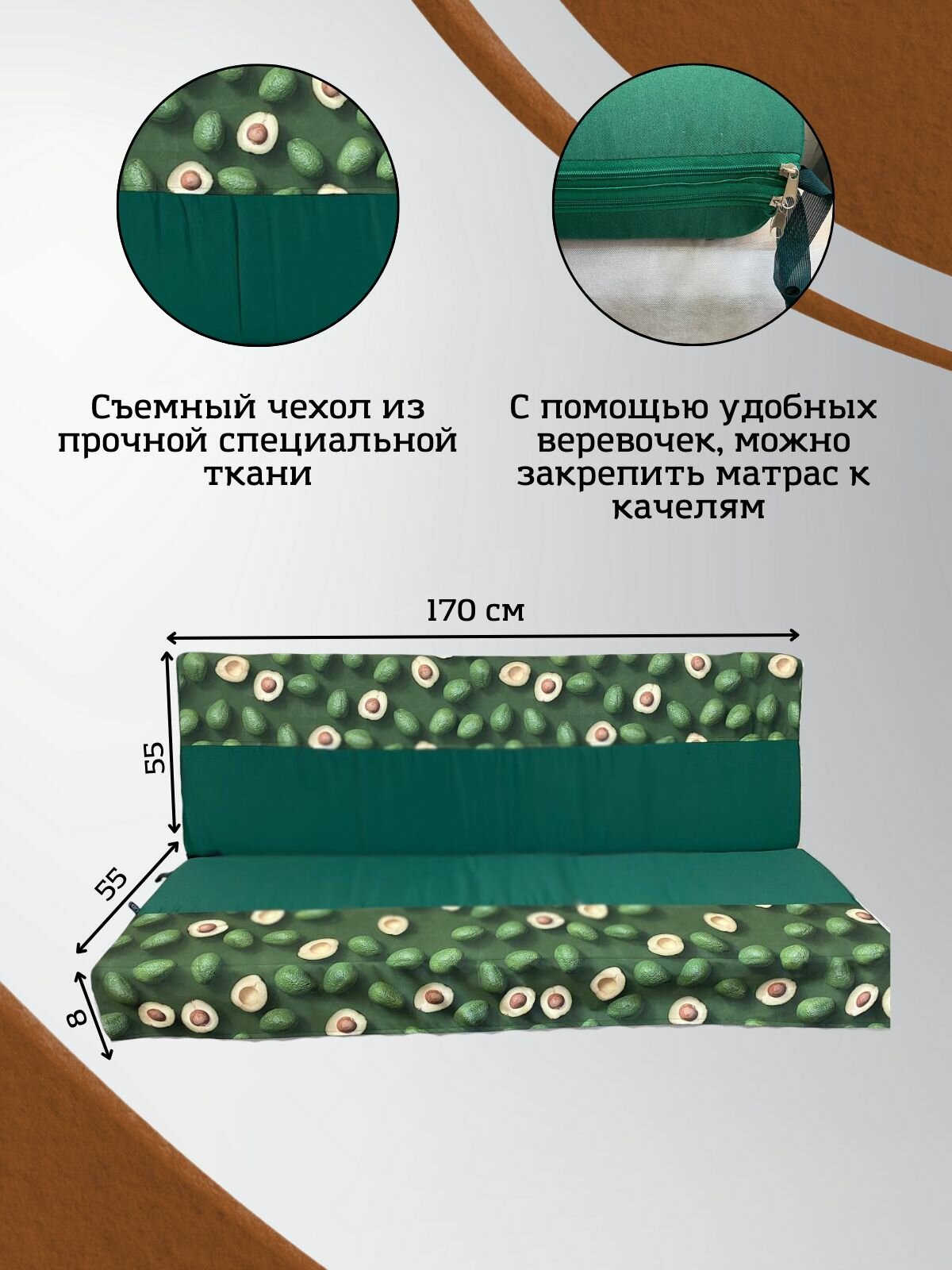 Съемный чехол на матрас для садовых качелей — это необходимый аксессуар на даче, если вы хотели заменить старую обшивку матраса качелей. Защитный чехол изготовлен из плотной ткани грета, (хлопок и полиэстер), которая устойчива к износу и защищает матрас от быстрого выгорания и загрязнения. Чехол легко снимается, его можно стирать. Благодаря этому, матрас всегда будет оставаться чистым и сухим, что поможет продлить срок его службы на очень долгое время. При необходимости можно постирать чехол при температуре 30 градусов. Ширина матраса 170 см, глубина сиденья и высота спинки 55 см, толщина 8 см.