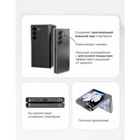 Задняя поверхность выполнена из прочного поликарбоната, а бампер из термопластичного полиуретана. Прозрачный материал сохраняет оригинальный внешний вид устройства. Проподнятый край чехла над дисплеем не позволяет Samsung царапаться при контакте с поверхностью. Качественная проработка деталей не затрудняет нажатме кнокок и управление устройством. Складывается вместе со смарфтоном