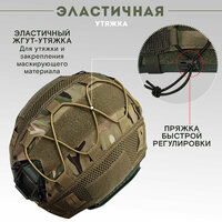 Чехол на тактический шлем оснащен пряжкой для быстрой регулировки и эластичным жгутом для утяжки и закрепления маскирующего материала.
