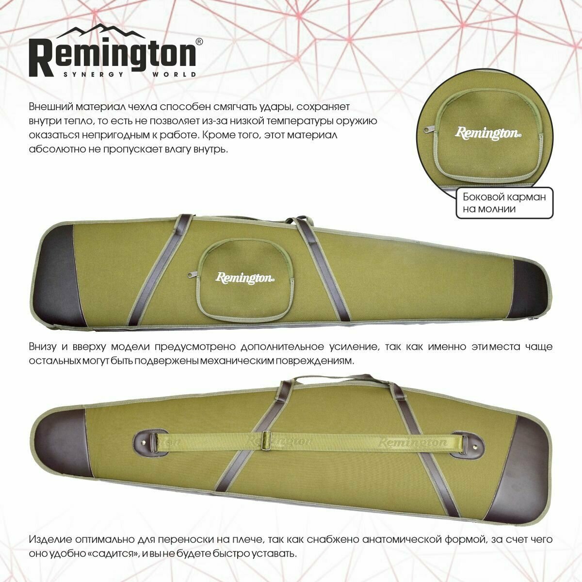 Чехол для оружия - отличный вариант для гладкоствольного, нарезного, а также пневматического оружия с оптическим прицелом. Данная модель плотно облегает оружие внутренней синтетической тканью, тем самым защищает его от любых внешних воздействий. Основной материал оружейного чехла Ремингтон - высококачественный кордур. Данный материал ценится за счет того, что способен смягчить удары, сохранить внутреннее тепло, то есть не позволяет оружию оказаться в непригодном состоянии из-за низкой температуры. Плюс ко всему, высококачественный кордур абсолютно не пропускает влагу внутрь.