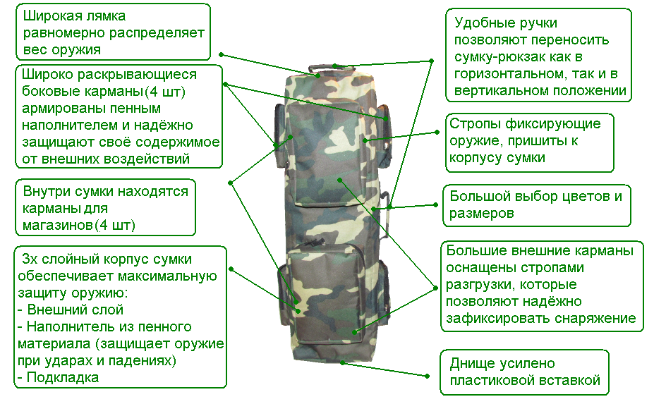 Кроме того, широкая лямка, две ручки для переноски, надёжная фиксация оружия в сумке и продуманный дизайн выгодно отличают её от конкурентов.