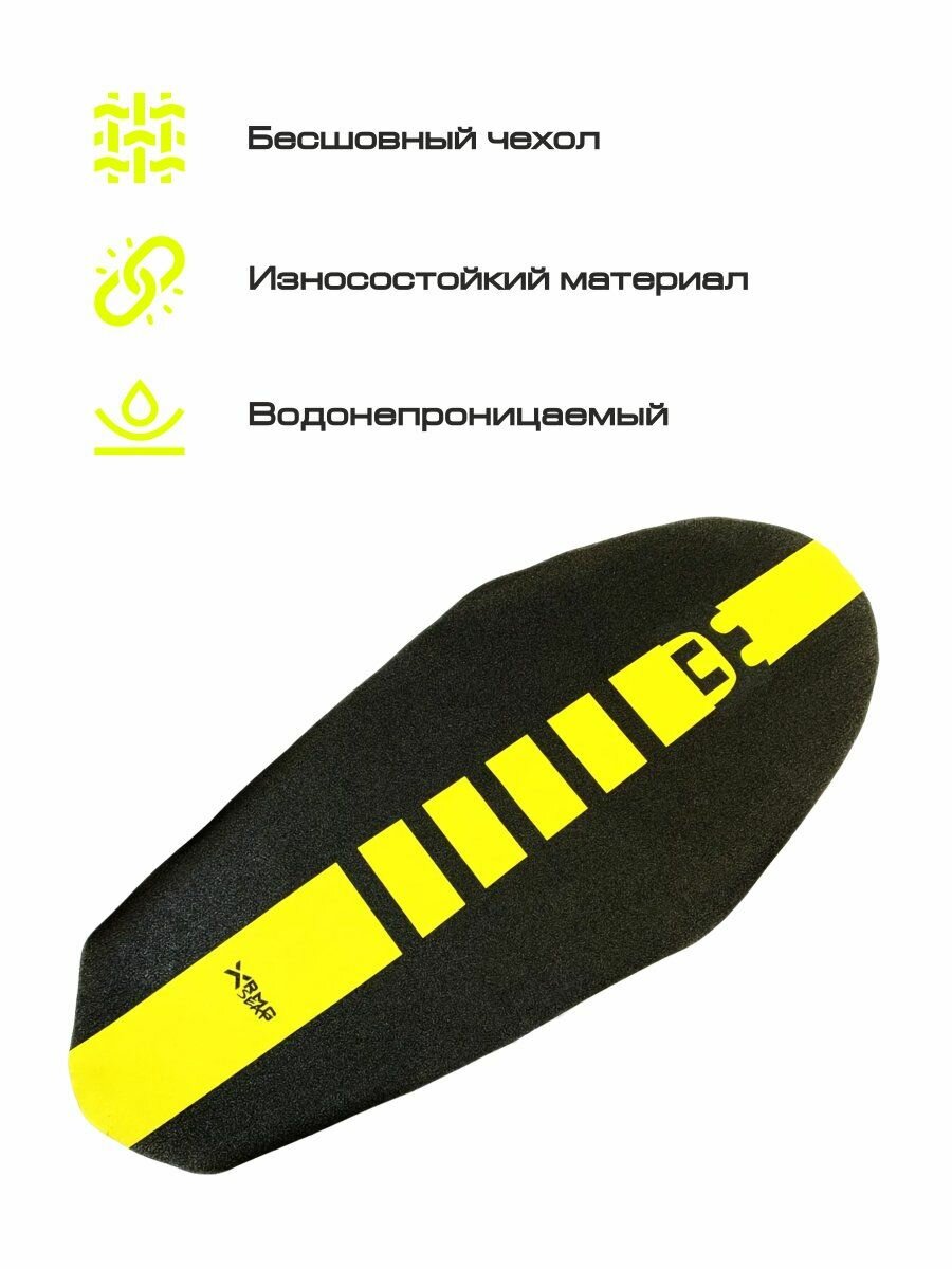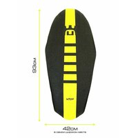 Универсальный бесшовный чехол на сиденье для кроссовых и эндуро мотоциклов, подходит на мотоциклы KTM, Husqvarna, Gas Gas, Yamaha, Honda, Kawasaki и других подобных. Крепкий, водонепроницаемый материал. Длина чехла 93 см. Ширина в самом широком месте 42 см. При покупке сверяйте размеры с вашим сиденьем. Для монтажа чехла потребуется степлер. Края чехла загибаются и крепятся степлером с обратной стороны сиденья.