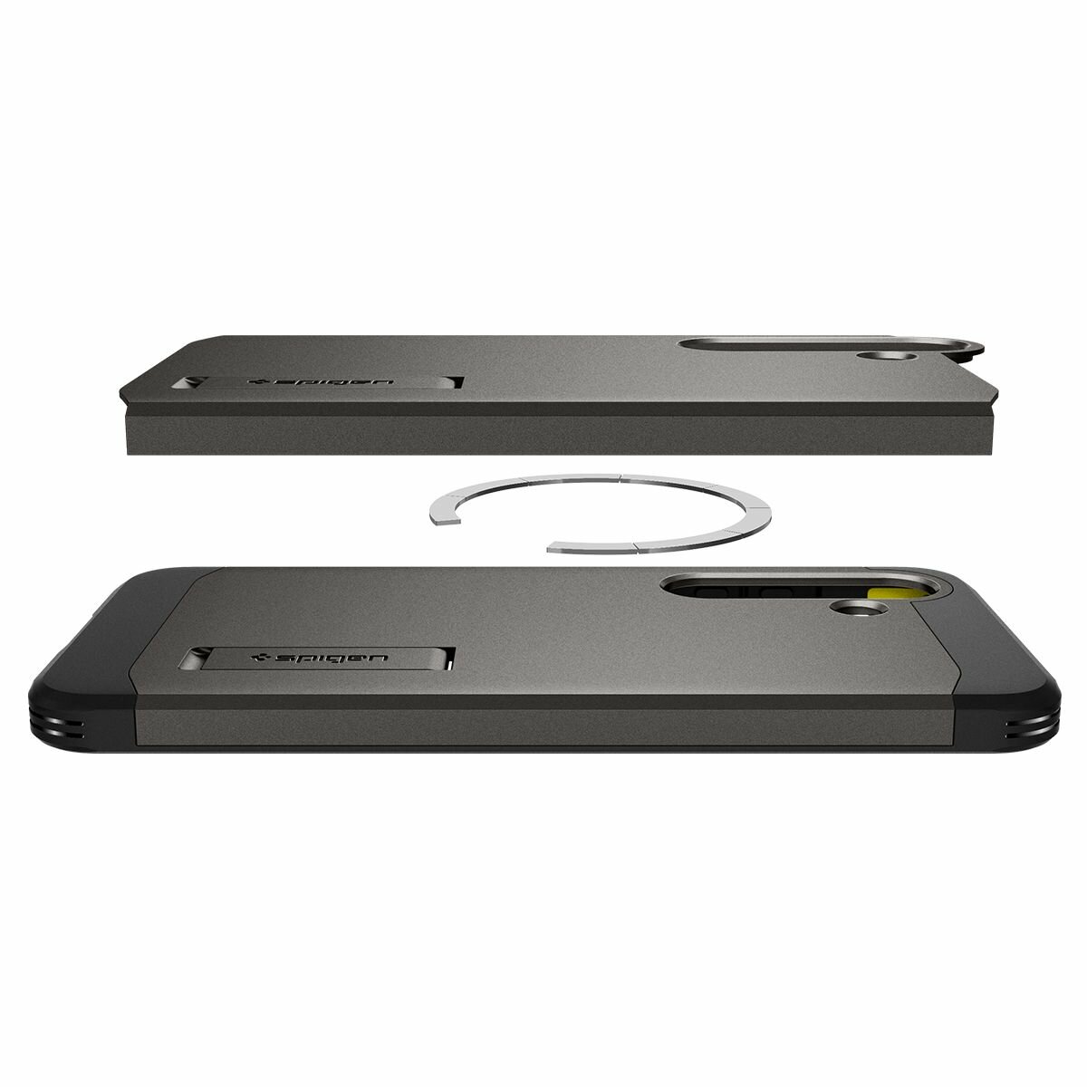 Его двухкомпонентная конструкция изготовлена из износостойкого термопластика и армирующей поликарбонатной рамы. Внутри крышки есть наполнитель в виде технологической пены, которая обеспечивает дополнительный защитный слой от ударов или падения устройства. Чехол идеально подходит и это не ограничивает возможности беспроводной зарядки. Слегка приподнятая форма корпуса вокруг камеры и экрана защищает ее от царапин, поднимая телефон чуть выше плоской поверхности. Он имеет крышки для кнопок и вырезы для портов.