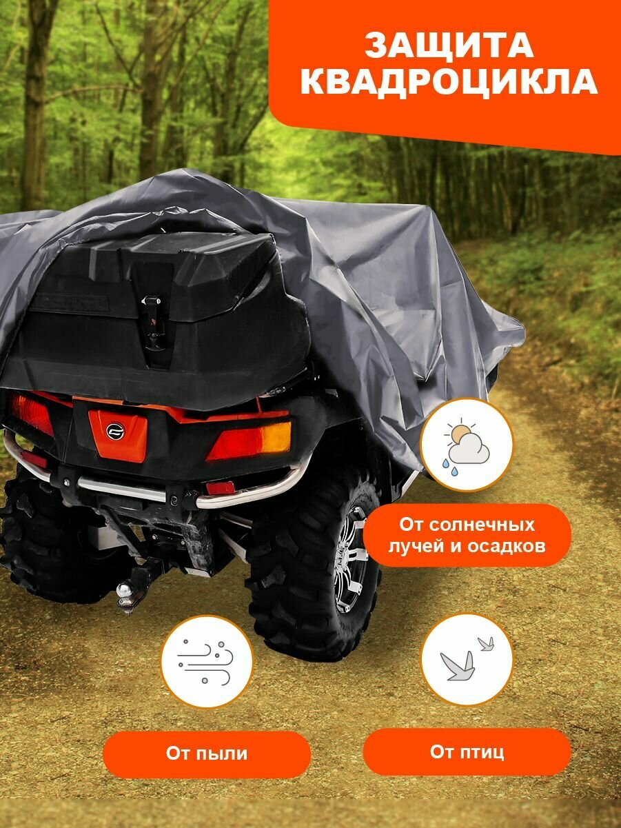 Изготовленный из прочного материала Оксфорд, он надежно защищает от дождя, снега, пыли и даже града. Солнцезащитный тент предотвращает воздействие ультрафиолета, предлагая полную защиту вашему квадроциклу.