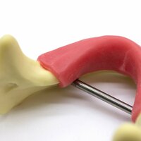 Изготовлена из прочного пластика, модель точно воспроизводит анатомические особенности нижней челюсти, включая костный гребень. Это позволяет наглядно продемонстрировать и отработать все этапы имплантации и расщепления костного гребня.