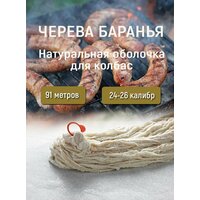 Натуральная баранья оболочка (черева) 24-26 мм, -91 метров (тонкие кишки, расположенные от желудка до слепой кишки, включающие, двенадцатиперстную, тощую и подвздошную), используется при изготовлении сосисок, купат, колбасок, сарделек в домашних условиях. Черева является натуральным съедобным продуктом, который полностью переваривается организмом. Хорошая паро- и дымопроницаемость позволяют использовать череву для приготовления любых видов колбас и ветчины, особенно важны эти характеристики для сыровяленых и копченых изделий. Срок годности натуральной оболочки 12 месяцев с даты производства. Условия хранения: при температуре не выше +25 градусов Цельсия и относительной влажности воздуха не более 85 процентов. Рекомендации по использованию: оболочку извлечь из упаковки, промыть в проточной воде при температуре 20-30 градусов Цельсия, далее использовать для производства колбасных изделий. Самый лучший вкус и запах колбасы можно получить, применяя натуральный продукт.