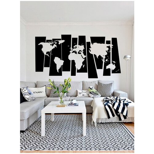 Наклейка на стену Большая картам Мира, выполнена из черной самоклеящейся плёнки, наклеивается полосками как пазл.