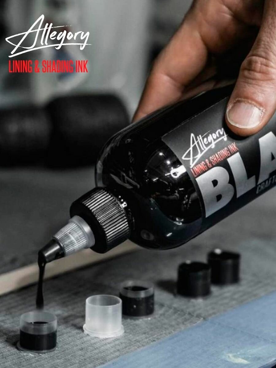 Allegory Lining and Shading Tattoo Ink отличная черная краска для идеальных линий и покраса. Попробовав работать этой краской, вам вряд ли захочется использовать другую краску. Идеальные плотные контуры без подтеков в один проход. Сделано в США.