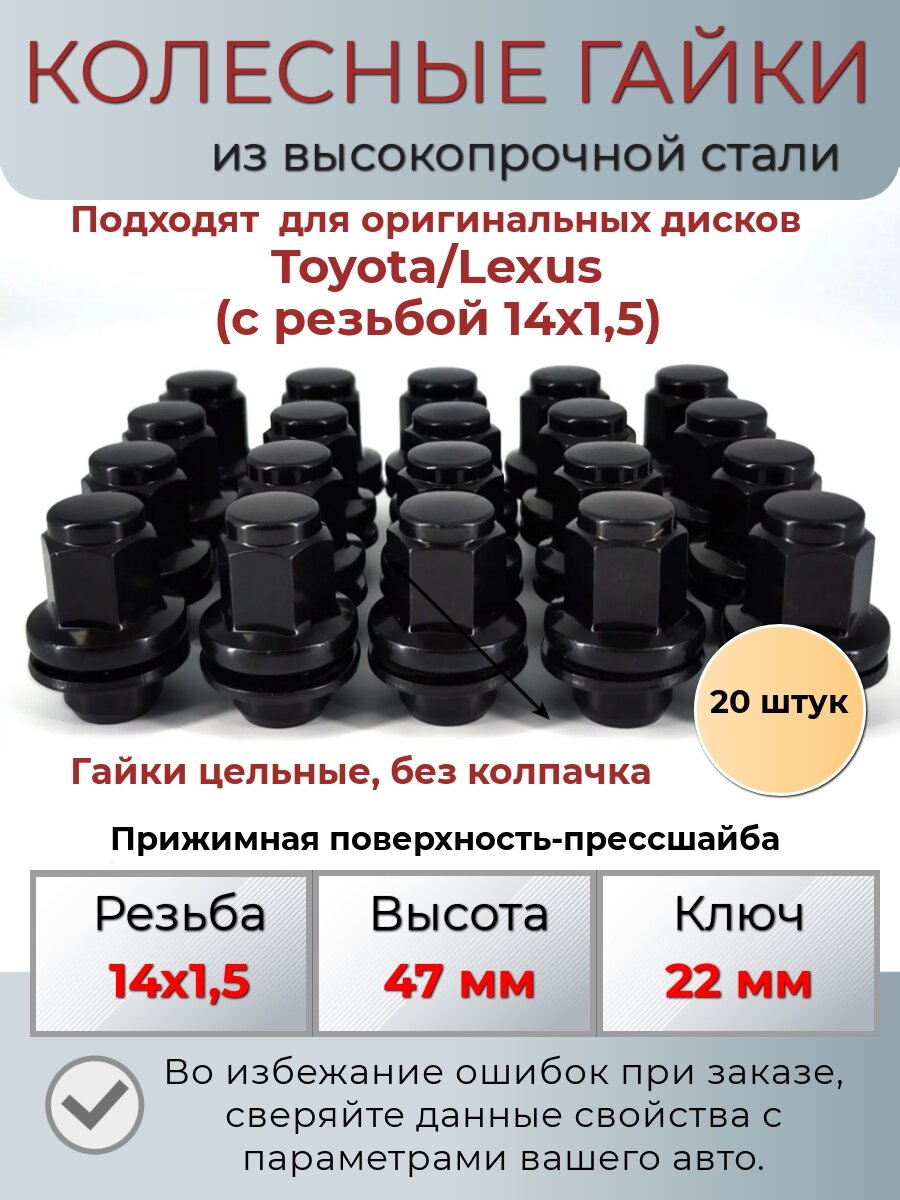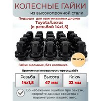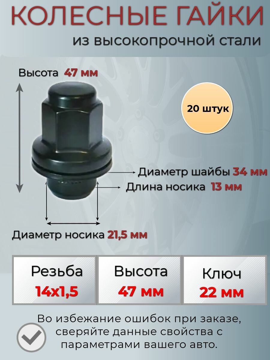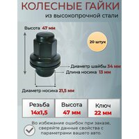 Колесные гайки цельные без колпачка для крепления оригинальных (штатных) дисков автомобиля.- Материал: высокопрочная сталь. Класс прочности: 8.8 (соответствует требованиям к колесному крепежу мировых производителей автомобилей)- Резьба: 14х1.5- Высота, мм: 47-- Прижимная поверхность: прессшайба--Диаметр шайбы: 34 мм, Диаметр носика-21,5 мм, Высота носика: 13 мм, Покрытие: черные-- Ключ: 22 мм-Комплект: 20 шт.- Внимание!- Во избежание ошибок при заказе гаек для колес, сверяйте данные свойства с параметрами вашего авто. Обращайте внимание на диаметр, шаг резьбы и прижимную поверхность.