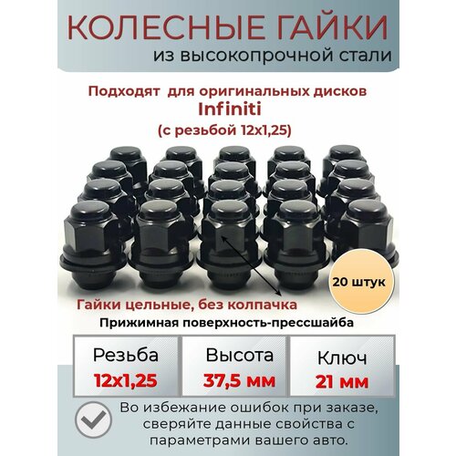 Колесные гайки цельные без колпачка для крепления оригинальных (штатных) дисков автомобиля.- Материал: высокопрочная сталь. Класс прочности: 8.8 (соответствует требованиям к колесному крепежу мировых производителей автомобилей)- Резьба: 12х1.25- Высота, мм: 37,5-- Прижимная поверхность: прессшайба--Диаметр шайбы: 30 мм, Диаметр носика-20 мм, Высота носика: 12 мм, Покрытие: черноем-- Ключ: 21 мм-Комплект: 20 шт.- Внимание!- Во избежание ошибок при заказе гаек для колес, сверяйте данные свойства с параметрами вашего авто. Обращайте внимание на диаметр, шаг резьбы и прижимную поверхность. Колесные гайки играют ключевую роль в безопасности и надежности автомобилей . Наши колесные гайки для автомобилей Infiniti производятся с использованием высококачественных материалов и передовых технологий. Они обладают прочной конструкцией, способной выдерживать высокий уровень нагрузок, и обеспечивают надежное крепление колес к автомобилю. Кроме того, они обладают устойчивостью к коррозии и долговечностью, что делает их идеальным выбором для эксплуатации в различных условиях дороги и климатических зон.