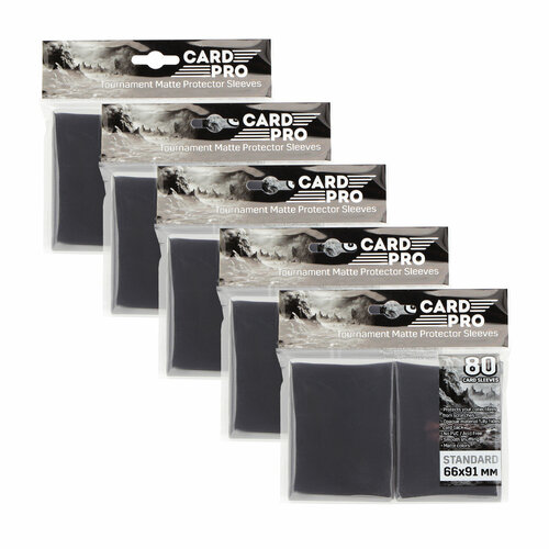 В наборе 5 упаковок по 80 матовых протекторов Card-Pro размером 66х91мм. Протекторы подходят для большинства коллекционных карточных игр. Одной пачкой протекторов вы сможете "нарядить" всю колоду, включая сайдборд, и у вас останется 5 протекторов "про запас".