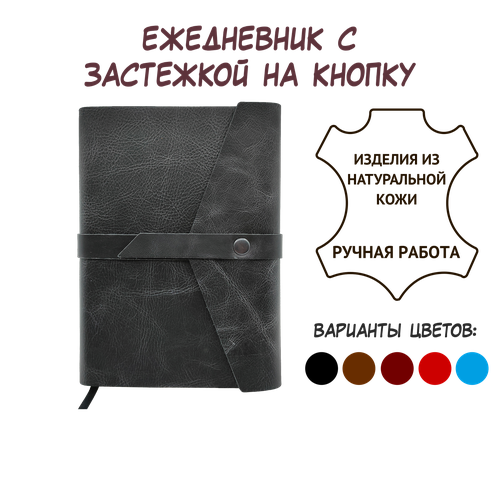 Ежедневник из натуральной кожи с эффектом Пулл-ап (Pull-Up): гладкая, мягкая, при изгибе меняет цвет с появлением новых жилок, придающих изделию неповторимый и изысканный вид. Кожа для этой обложки обработана и защищена от грязи с внешней стороны. Лаконичный дизайн с застежкой на кнопку и декоративной горизонтальной полоской подойдет деловому и творческому человеку на любых форматах встреч. Блок недатированный 256 страничный формата А5 с печатью в один цвет (темно — серый). Плотность бумаги блока — 70 г/м2. Цвет блока: слоновая кость. Цвет обложки в зависимости от модели: черный, коричневый, темно-синий, светло-синий, бордовый (винный) и красный.
