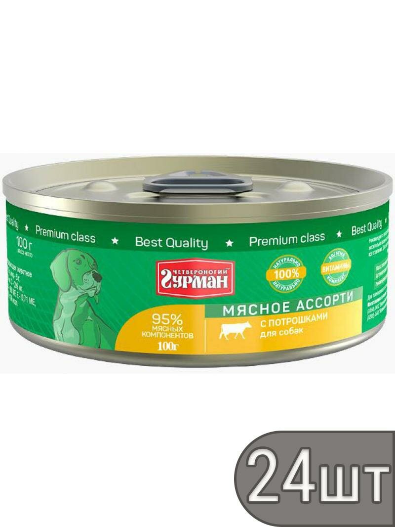 Четвероногий Гурман Набор 24 шт Консервы для собак «Мясное ассорти» с потрошками, 100г 2.4 кг: сравнение цен, характеристики, фото, актуальное наличие и цены.