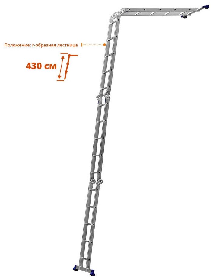трансформация: стремянка, платформа, приставная лестница, г-образная лестница; размер профиля: 63х25х1.25 мм, 60.2х22.5х1.5х2.0 мм; стальные шарнирные соединения с замками; рифленые ступени, размер профиля ступеней 25х25х1.25 мм; съёмные траверсы шириной 80 см с противоскользящими пластиковыми опорными наконечниками