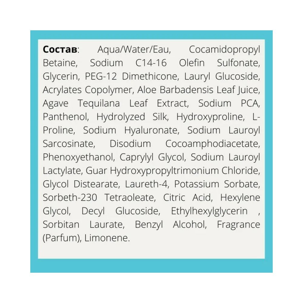 Состоит: Вода, кокамидопропилбетаин, сульфонат олефина натрия C14-16, глицерин, PEG-12 диметикон, Лаурилглюкозид, сополимер акрилатов, сок листьев Алоэ Барбаденсис, экстракт листьев агавы Текиланы, PCA натрия, Пантенол, гидролизованный шелк, гидроксипролин, L-пролин, гиалуронат натрия, Лауроилсаркозинат натрия, динатрия Кокоамфодиацетат, феноксиэтанол, Каприлгликоль, лауроиллактилат натрия, Гидроксипропилтримония хлорид Гуара, гликоль дистеарат, лаурет-4, сорбат калия, сорбет-230 Тетраолеат, лимонная кислота, Гексиленгликоль, Децилглюкозид, Этилгексилглицерин, Сорбитан Лаурат, Бензиловый Спирт, Ароматизатор, Лимонен.