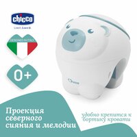 Ночник-светильник северного сияния Полярный мишка от Chicco для малышей с рождения создаст волшебную атмосферу в спальне и поможет уснуть. Динамичная цветная проекция увлечет за собой в мир нетающего снега, белых медведей и ярких всполохов в небе. 30 минут классической музыки (композиции Моцарта, Баха и Глинки) и звуков природы. Аксессуар для комнаты легко настроить с помощью трех кнопок для регулирования громкости (2 уровня), выбора мелодии, активации проекции. Игрушку 2-в-1 для сна можно разместить на тумбочке или на бортике кровати. Ночник детский для сна подходит как для кроваток Chicco Next2Me, так и для других люлек с бортиком до 38 мм. Проектор детский работает от 3 батареек АА 1,5В (не в комплекте).