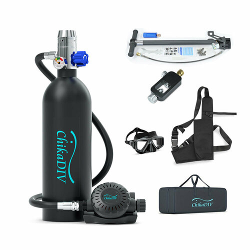 Небольшой подводный баллон CHIKADIV C400 1 л (регулятор отдельно от корпуса, их необходимо соединить), подводный адаптер, очки для подводного плавания, портативная сумка для подводного плавания, сумочка, насос второго поколения, руководство пользователя и некоторые запасные части.