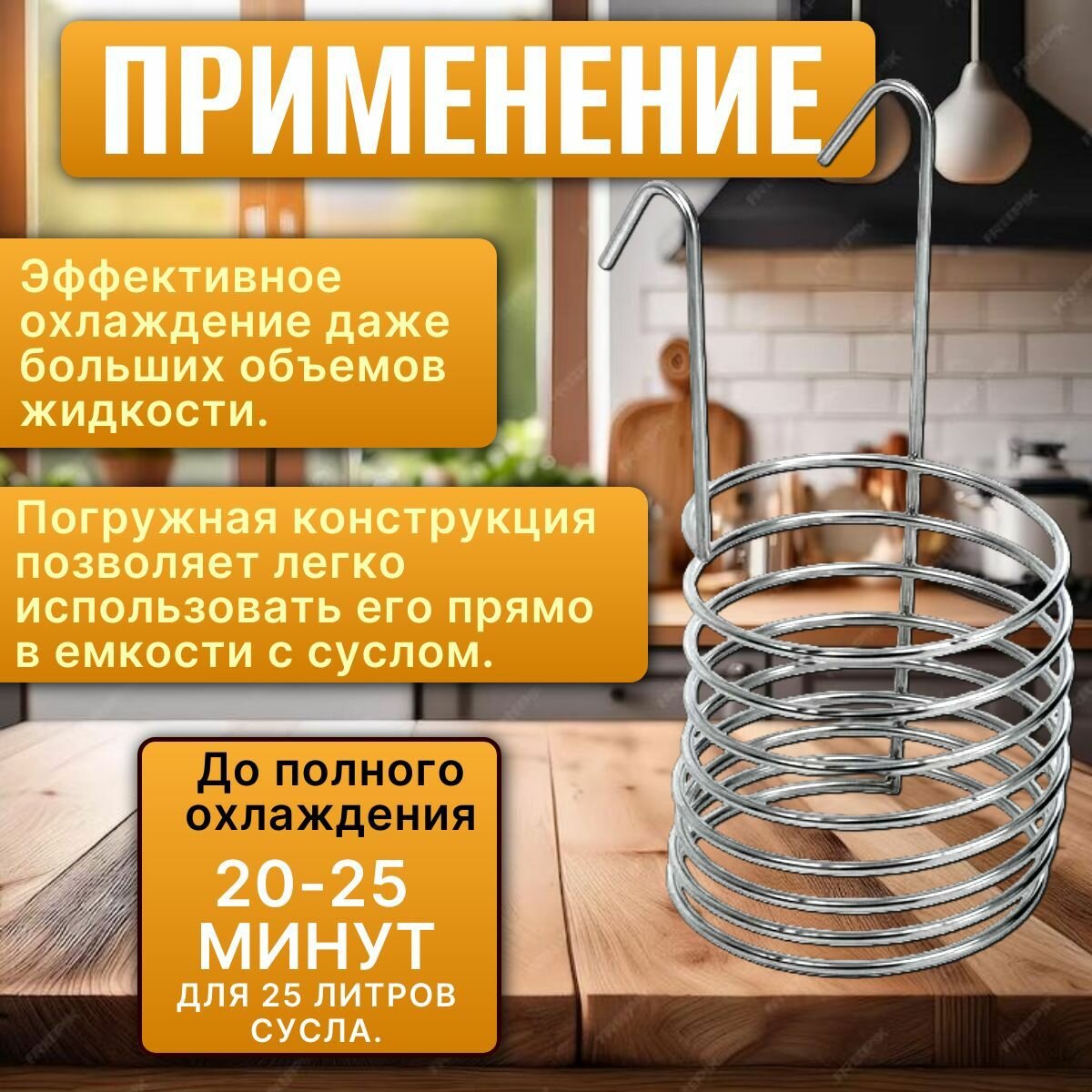 Чиллер охладитель сусла погружной длиной 7 метров – это идеальное решение для быстрого охлаждения сусла после кипячения. Благодаря своей продуманной конструкции и высокому качеству материалов, этот чиллер обеспечивает эффективное охлаждение даже больших объемов жидкости. Погружная конструкция позволяет легко использовать его прямо в емкости с суслом, без необходимости перекачивания жидкости через внешние системы. Медные трубки обеспечивают отличную теплопроводность, что значительно ускоряет процесс охлаждения. Длина в 7 метров гарантирует равномерное распределение холода по всему объему сусла, предотвращая образование горячих зон. Этот чиллер прост в установке и эксплуатации, он надежен и долговечен. Он станет незаменимым помощником для любого пивовара, стремящегося к идеальному результату. С таким устройством вы сможете сократить время приготовления пива и получить напиток высокого качества. Принцип работы следующий: вы приготовили сусло и вам нужно его быстро охладить. Вы опускаете чиллер в еще кипящее сусло на несколько минут, чтобы высокой температурой его продезинфицировать. Спустя несколько минут вы снимите кастрюлю с суслом и опущенным туда чиллером с огня. Подсоедините одну трубку к крану в раковине или к лейке от душа, а конец второго шланга опускаете в раковину или ванную. Включаете холодную воду и вода проходя по всем трубкам максимально быстро и безопасно охлаждает ваше сусло. Перед первым использованием чиллер нужно поместить В кипящую воду на 20 минут Время охлаждения зависит от температуры подаваемой воды. Среднее время, при котором сусло охлаждается до комнатной температуры - 20-25 минут. (для 25 литров сусла) Диаметр 215 мм Общая высота 480 мм Количество витков 9 Диаметр трубы внешний 8 мм Общая длина 7 м Материал нержавеющая сталь