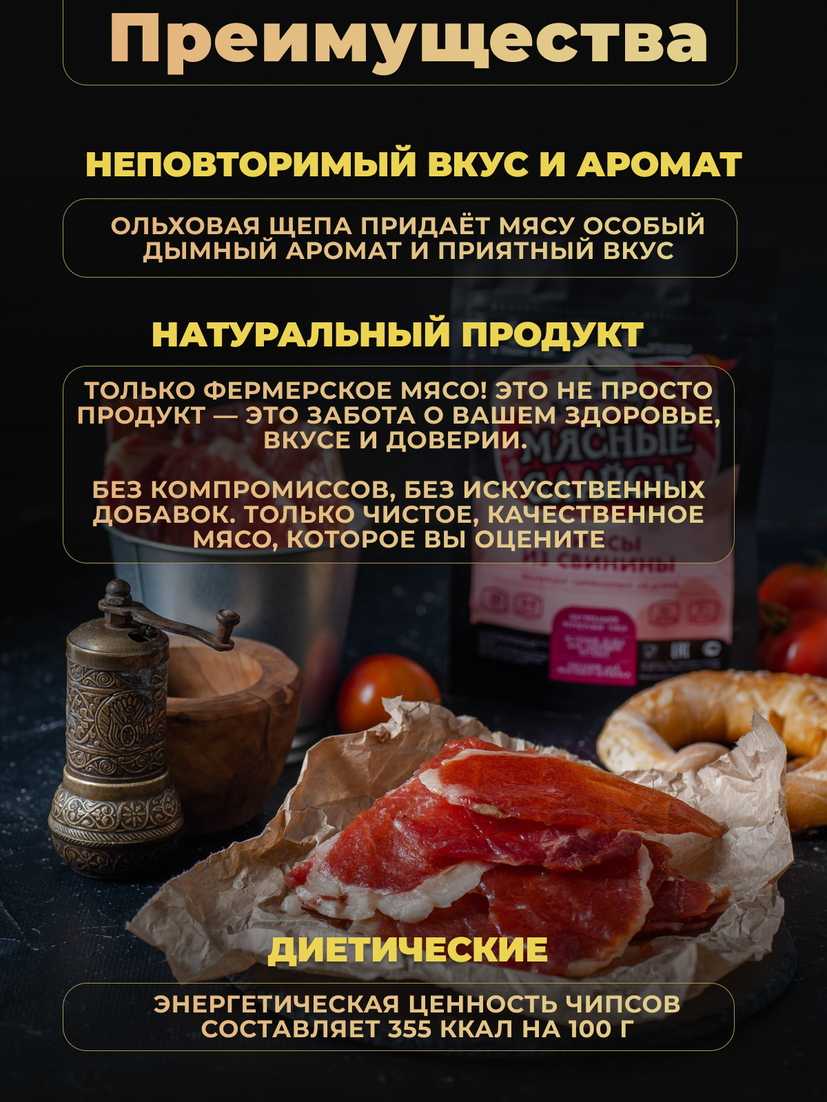 Откройте для себя по-настоящему уникальный вкус и аромат натуральных сыровяленых чипсов, созданных по особой технологии из отборного свиного мяса. Эти нежные ломтики станут превосходным вариантом как для легкого перекуса, так и для праздничного стола. Мы сочетаем уважение к традициям и современные подходы, чтобы вы могли наслаждаться каждым кусочком. Для изготовления используются только свежие свинные части высшего качества от надежных отечественных поставщиков. Каждый кусок проходит строгую проверку, чтобы соответствовать самым высоким стандартам. Специальное вяление на ольховых дровах придаёт нашим чипсам насыщенный аромат и богатый вкус.