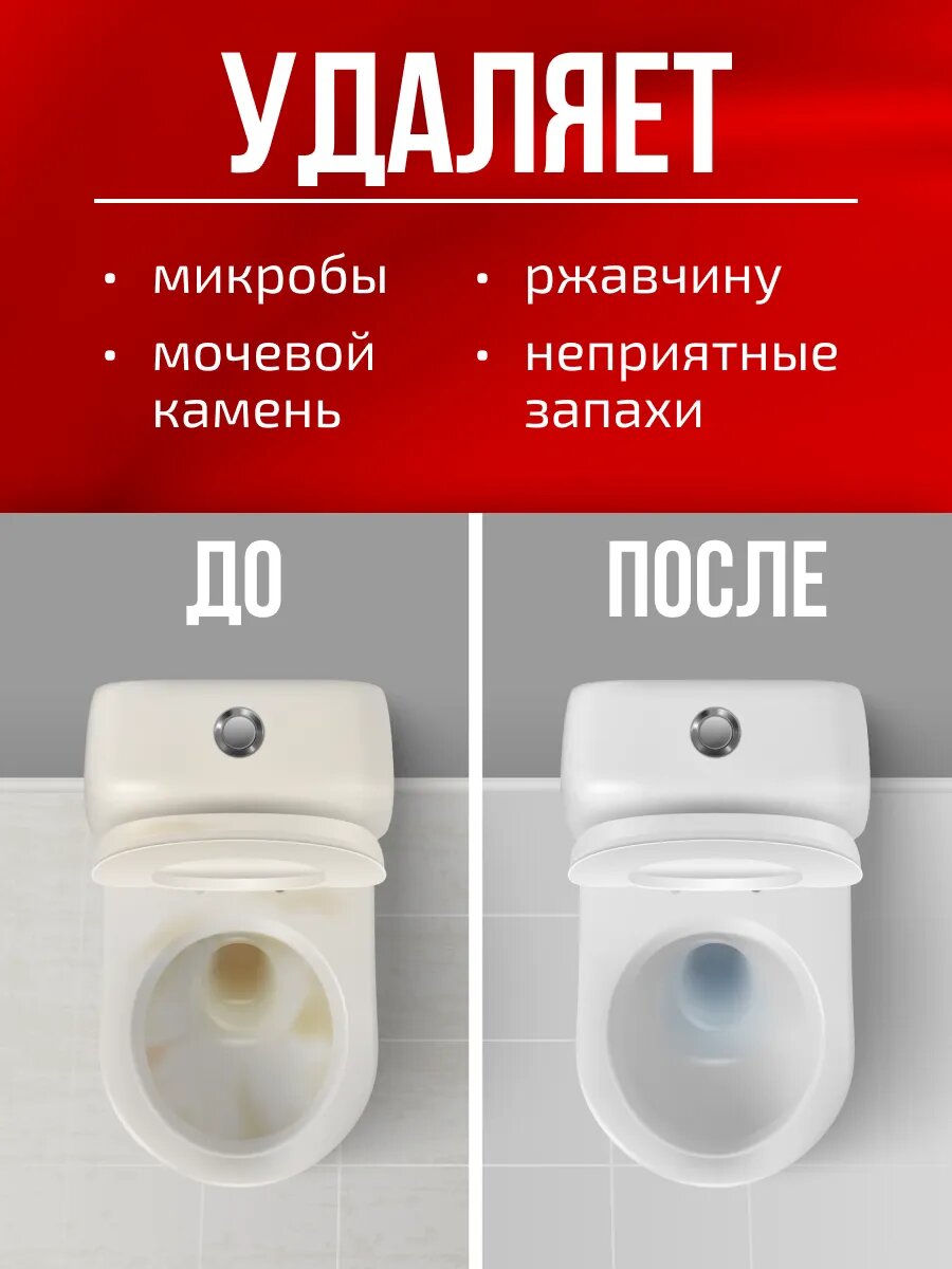 Средство для унитаза - это уникальный чистящий гель, разработанный специально для эффективной уборки. Его мощная формула избавляет от микробов и отбеливает самые стойкие следы загрязнений, поэтому он подходит как моющий очиститель для различной сантехники.