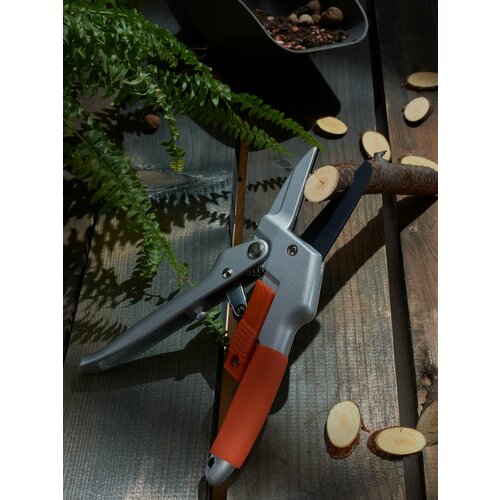 У секатора облегчённый высокопрочный корпус, уникальное лезвие, которое сделано из японской стали, с эффектом самозаточки. Тефлоновое покрытие лезвия, обеспечивает лёгкость реза и максимальную защиту от коррозии. Благодаря прямому лезвия секатор является многофункциональным, его можно использовать на кухне (разделка птицы и рыбы), дома (отлично режет штампики, рейки, плинтус и т. п.).