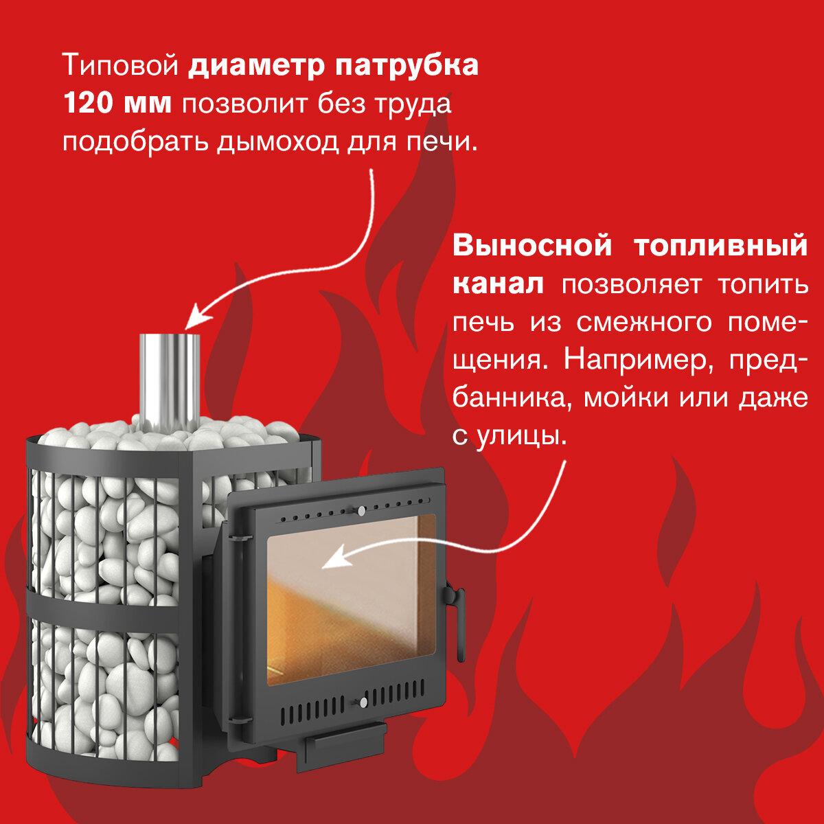 Печь работает на дровах и топливных брикетах, что делает ее удобной и экономичной в использовании.