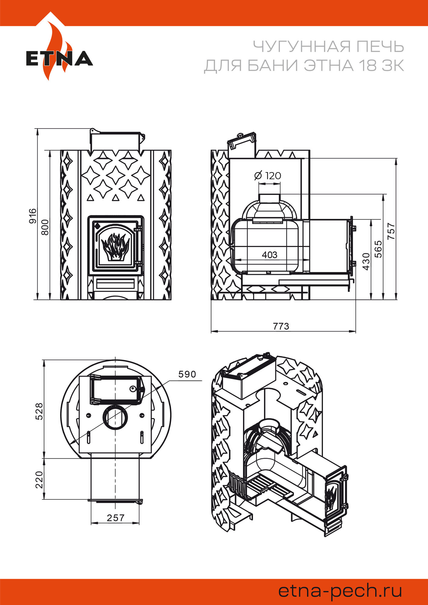 Банная печь этна ЗК 18 ДТ-4С изготовлена из чугуна высокого качества. Материал с высокой теплопроводностью, чугун быстро передаёт энергию сжигаемого топлива наружу, в пространство парной. Толщина деталей корпуса составляет 6-8 миллиметров.