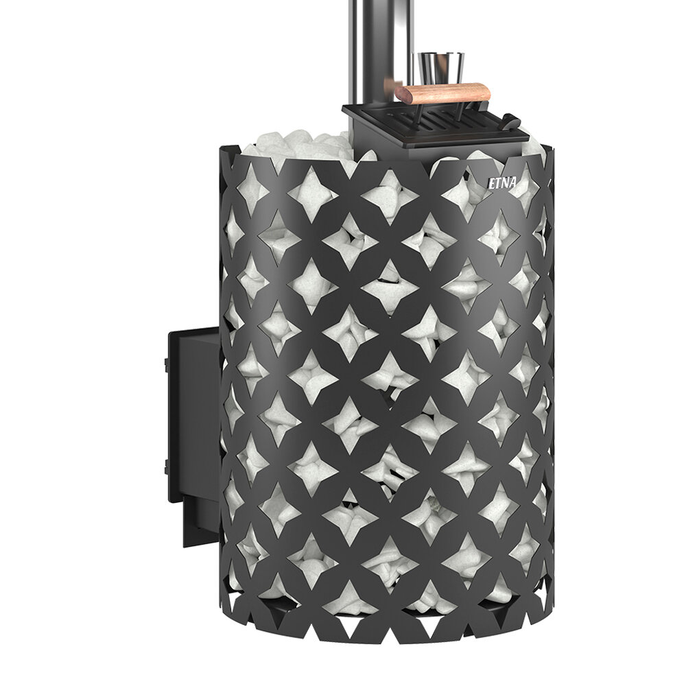 Для устройства наружной открытой каменки печь этна ЗК 18 оснащается металлическим кожухом с прорезным рисунком оригинального дизайна. Пространство между печью и кожухом из двухмиллиметровой стали заполняется камнями для бани, которые выполняют роль теплонакопителя, перераспределяют тепло от стенок топки и защищают парящихся от жёсткого инфракрасного излучения. Воду подают на нагретые камни, с которых полученный пар распространяется по всему объёму парной. Кожух диаметром 560 миллиметров вмещает в себя до 110 килограммов камней крупной и средней фракции.