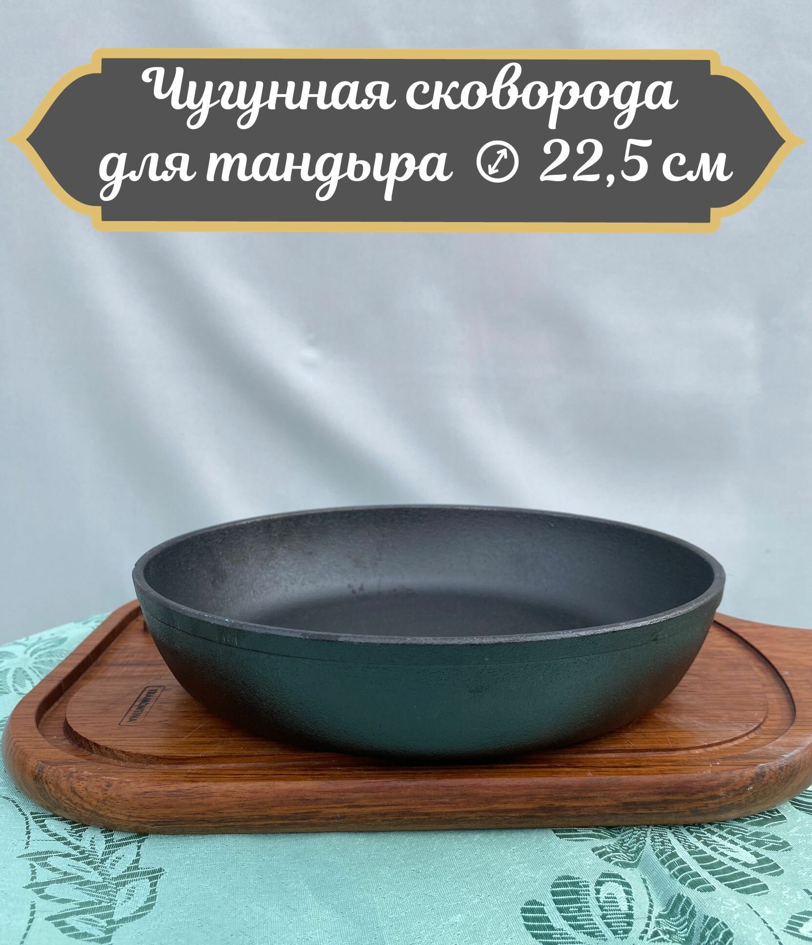 Сковорода для тандыра чугунная изготовлена путём отрезания ручки от сковороды чугунной литой для удобства погружения в тандыр. Боковой спил не влияет на функционал сковороды.