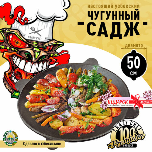 Садж чугунный с подставкой имеет круглую форму и выпуклое дно. Садж идеален для приготовления восточных блюд. Обратная сторона узбекской посуды может использоваться для выпекания лепешек или лавашей. Сковороду из чугуна используют на мангале, на газовой плите и на специальной печи. Также садж чугунный 50 может использоваться в качестве крышки для узбекского чугунного казана или для жарки шашлыка, необходимо лишь подобрать нужный размер. Чугун саджа равномерно прогревается и долго сохраняет полученное тепло. Гриль не боится перегрева. Садж для костра может находиться на открытом огне часами и при этом не бояться деформации. Конструкция способствует тому, сковорода с двумя ручками долго не остывает, а пища на ней долго остается горячей. При правильном уходе она со временем не портится, а становится только лучше. Чем активнее вы используете вок, тем быстрее появляется защитный слой, позволяющий забыть о пригорании пищи и о ржавчине. Сотейник имеет стенки толщиной 8-9 мм в зависимости от диаметра. Перед использованием его необходимо обжечь и прокалить согласно инструкции, которая идет в комплекте. Азербайджанская сковородка в поход универсальна и проста в использовании и подойдет для походной кухни, а также станет дополнением казана в качестве крышки. Если Вы истинный ценитель отдыха на природе и туризмпоходов обязательно дополните сковороду садж с ручками печкой от бренда Крейзи Шеф, которые так же могут быть использованы при приготовлении мяса и овощей. Плоская сковорода для плова уже в наличии! Чугунный инвентарь - оригинальный подарок мужчине на 23 февраля или женщине без повода. Туристическая сковорода для костра подойдет в качестве подарка как настоящему мужчине, так и женщине