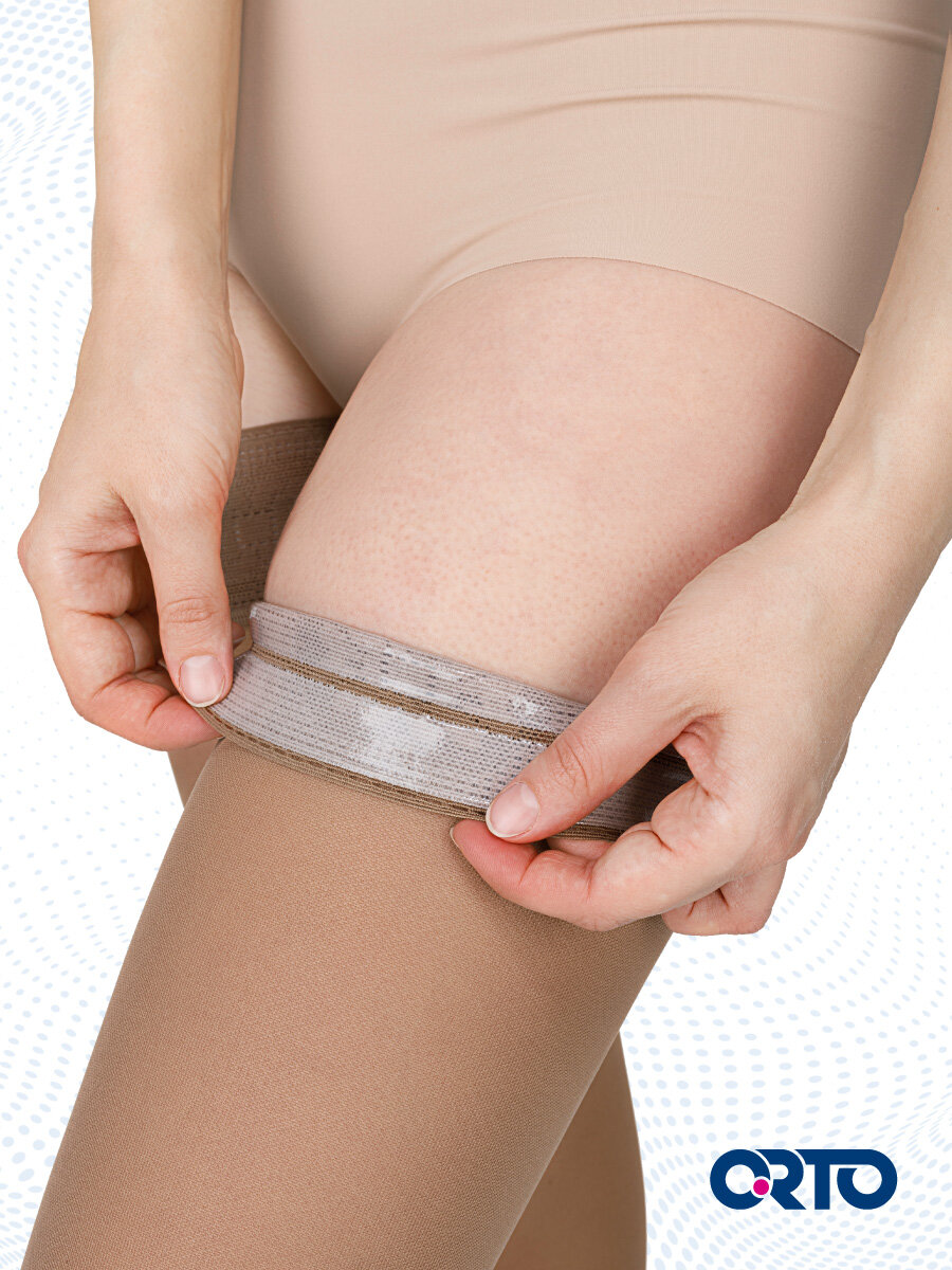 Создают легкую дозированную компрессию от лодыжки до верхней трети бедра. Имеют силиконовую ленту в верхней части, для фиксации.