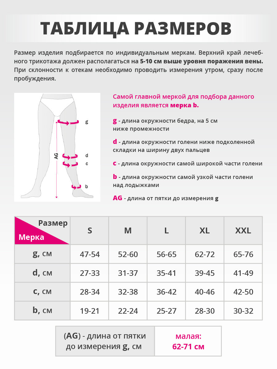 Размер изделия подбирается по индивидуальным анатомическим меркам конечности. Верхний край лечебного трикотажа должен располагаться на 5–10 см выше уровня поражения вены.