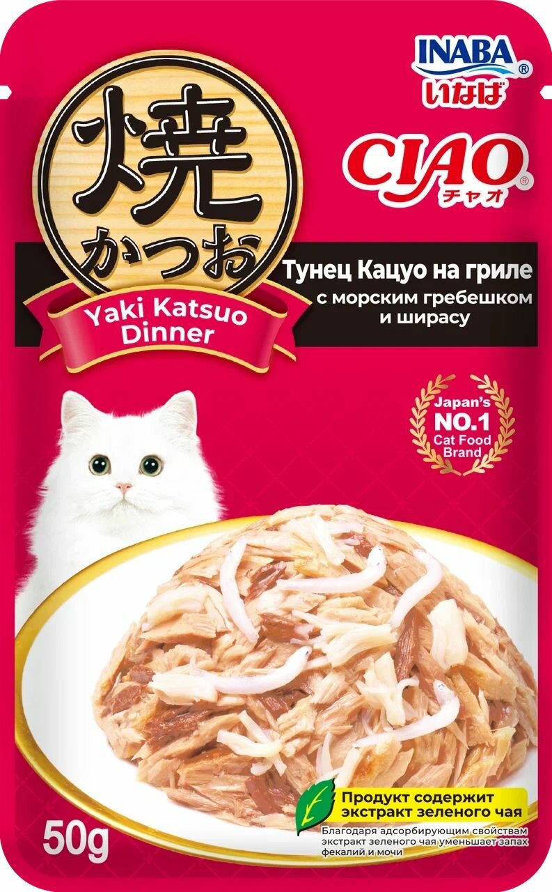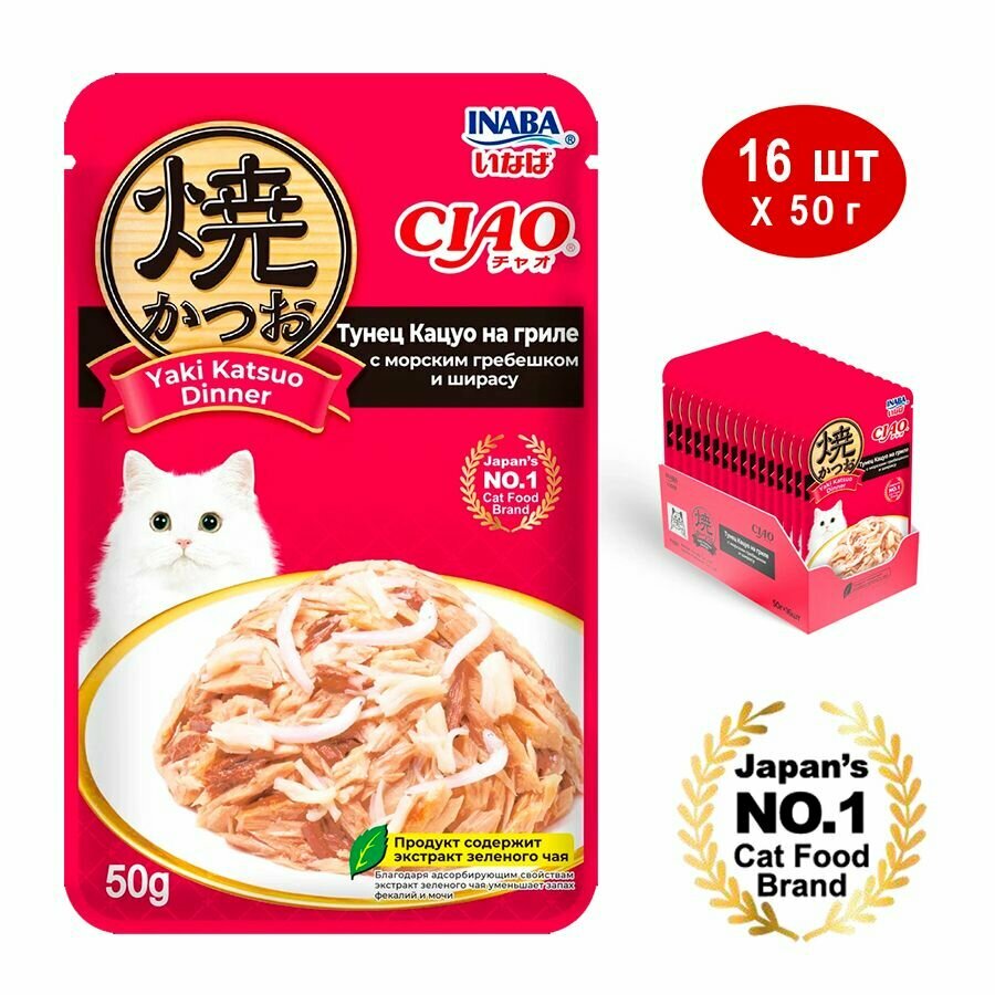 CIAO Yaki Katsuo Dinner Тунец Кацуо на гриле с морским гребешком и ширасу, паучи 16 x 50г: сравнение цен, характеристики, фото, актуальное наличие и цены.