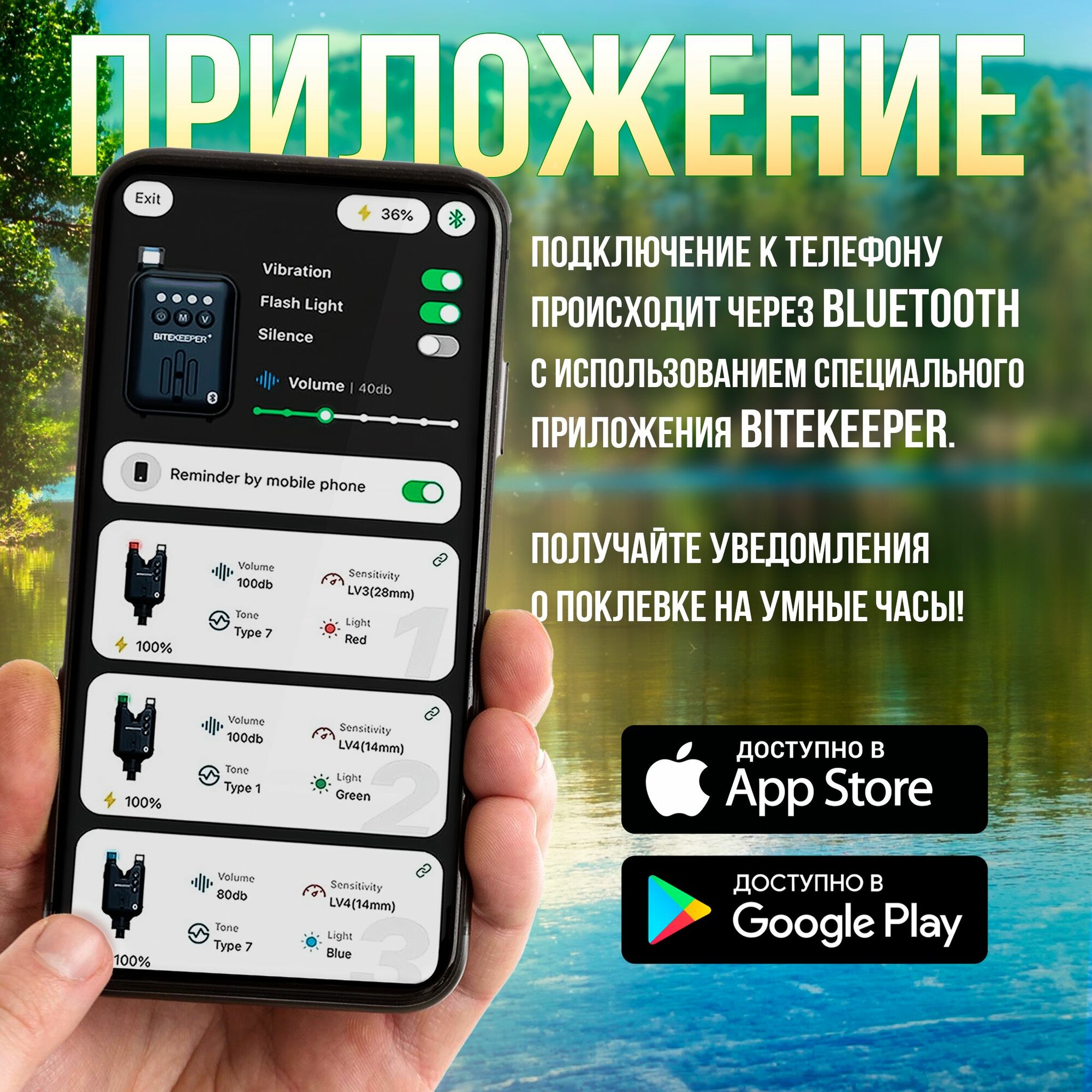 Подключение к телефону происходит через Bluetooth с использованием специального приложения BITEKEEPER, доступного для загрузки в Google Play и App Store, и уведомления о поклёвках также можно получать на умные часы.