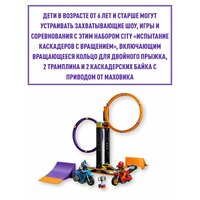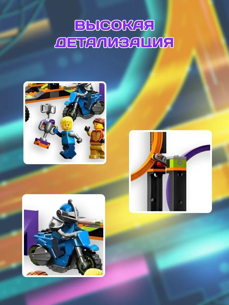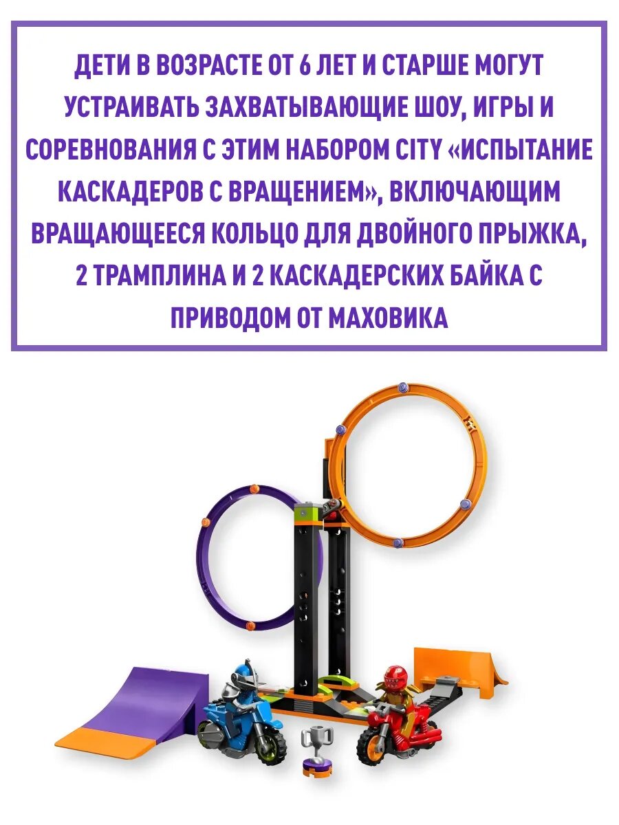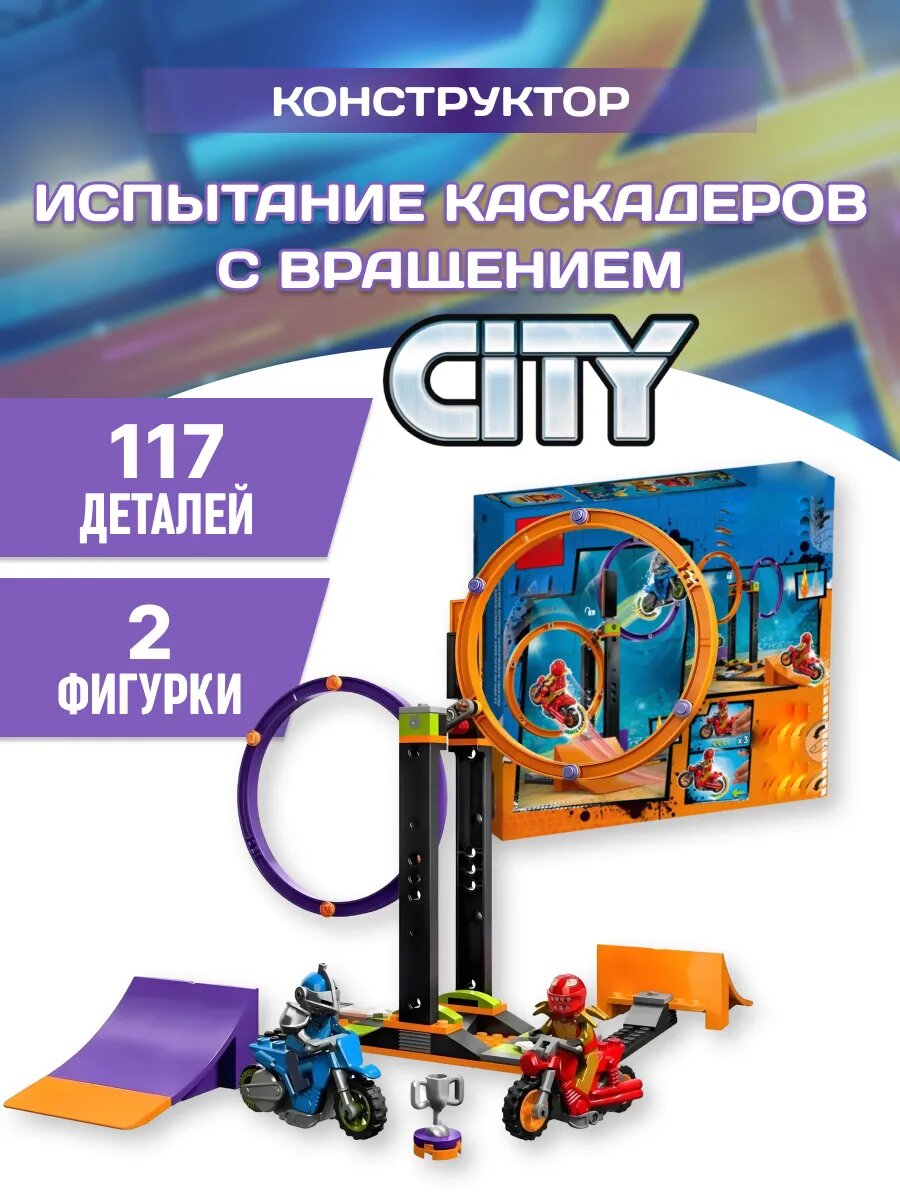 Дети в возрасте от 6 лет и старше могут устраивать захватывающие шоу, игры и соревнования с этим набором City «Испытание каскадеров с вращением», включающим вращающееся кольцо для двойного прыжка, 2 трамплина и 2 каскадерских байка с приводом от маховика. Плюс два мотоциклиста City Stuntz, чтобы начать веселье. Вы и ваш ребенок здорово проведете время, собирая этот конструктор. Помимо развлекательной функции он способствует развитию творческого мышления и тренирует мелкую моторику пальцев. Помогает детям осваивать окружающую действительность посредством веселого развлечения. Детские психологи считают, что с помощью такой игрушечки ребенок 7-8-9-10 лет прививает у себя самостоятельность, усидчивость и внимательность. Кроме этого, он учится конструировать и воплощать в жизнь придуманные модели и образы. Серия Cities - одна из самых разнообразных и широких линеек. Сити, как и любой современный город, очень специфичен и в нем все время кипит жизнь. Он позволяет детям создавать и воспроизводить увлекательные городские приключения. Наборы Urban позволяют ребенку создать город своей мечты, который станет безграничным простором для воображения. Сити и Урбан между собой сочетаются. Здесь найдется всё, дети могут собрать полицейские участки, автомобили и вертолеты, а также создать сценарии охоты на преступников и спасении граждан или создать пожарные части, пожарные автомобили и лестницы, а также спасать жителей города от огня или могут построить грузовики, экскаваторы, краны и другую технику. Такое занятие позволяет развивать необходимые для каждого навыки. Кроме того, большой конструктор еще и полезная игрушка, потому что требует от малыша внимания, сосредоточенности и аккуратности. Новинка будет прекрасным подарком для всех возрастов как мальчику-подростку так и девочке как новогодний презент, а также на День Рождения, 8 Марта или просто без повода.