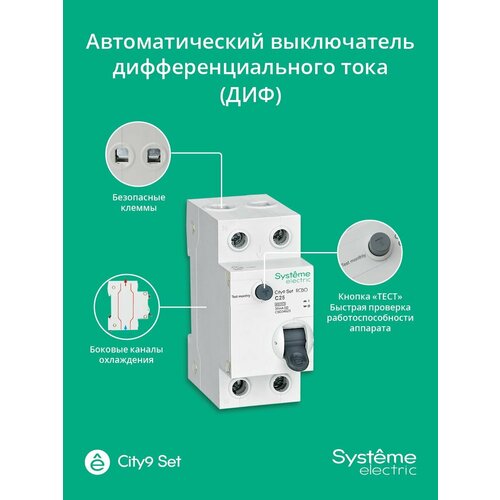 Автоматические выключатели дифференциального тока (АВДТ) серии City9 Set Systeme Electric,1P+N, характеристика С, Icn = 4.5 кА, ток утечки 30 мА, тип АС. АВДТ применяется в электрических сетях напряжением 230В. Предназначен для защиты сети от перегрузок, людей от поражения электрическим током и токов короткого замыкания. Уставка по току утечки 30 мА обеспечивает гарантированную защиту людей при прямом прикосновении. Кнопка тест обеспечивает проверку работоспособности аппарата. Крепление на DIN-рейку шириной 35 мм. Безопасные клеммы.