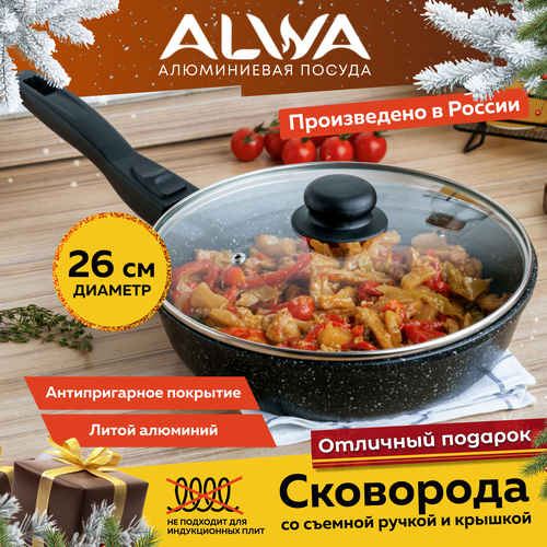 Посуда “Альва” - отличается высокой прочностью, изготовлена из пищевого высокопрочного алюминия. Глубокая сковородка литая, ее круглая форма идеальна для подачи аппетитных завтраков, обедов и ужинов для семьи из 3-4 человек. Произведенная в России, сковорода ALWA 26 см отличается высоким качеством и соответствует всем стандартам ГОСТ. Большая сковорода - универсальный подарок мужчине, любимому, папе, мужу на юбилей, подарок маме, бабушке, женщине День рождения, подарок на 23 февраля и 8 марта. Этот кухонный предмет является частью набора сковородок, который подойдет как для домашнего использования, столовой, так и для туризма, похода или походной кухни. Её можно брать с собой в рыболовный лагерь, на отдых на природе, кемпинг, подойдет для открытого огня, мангала, дачи, пикника, столовой, хостела, отеля или с легкостью готовьте на газу.