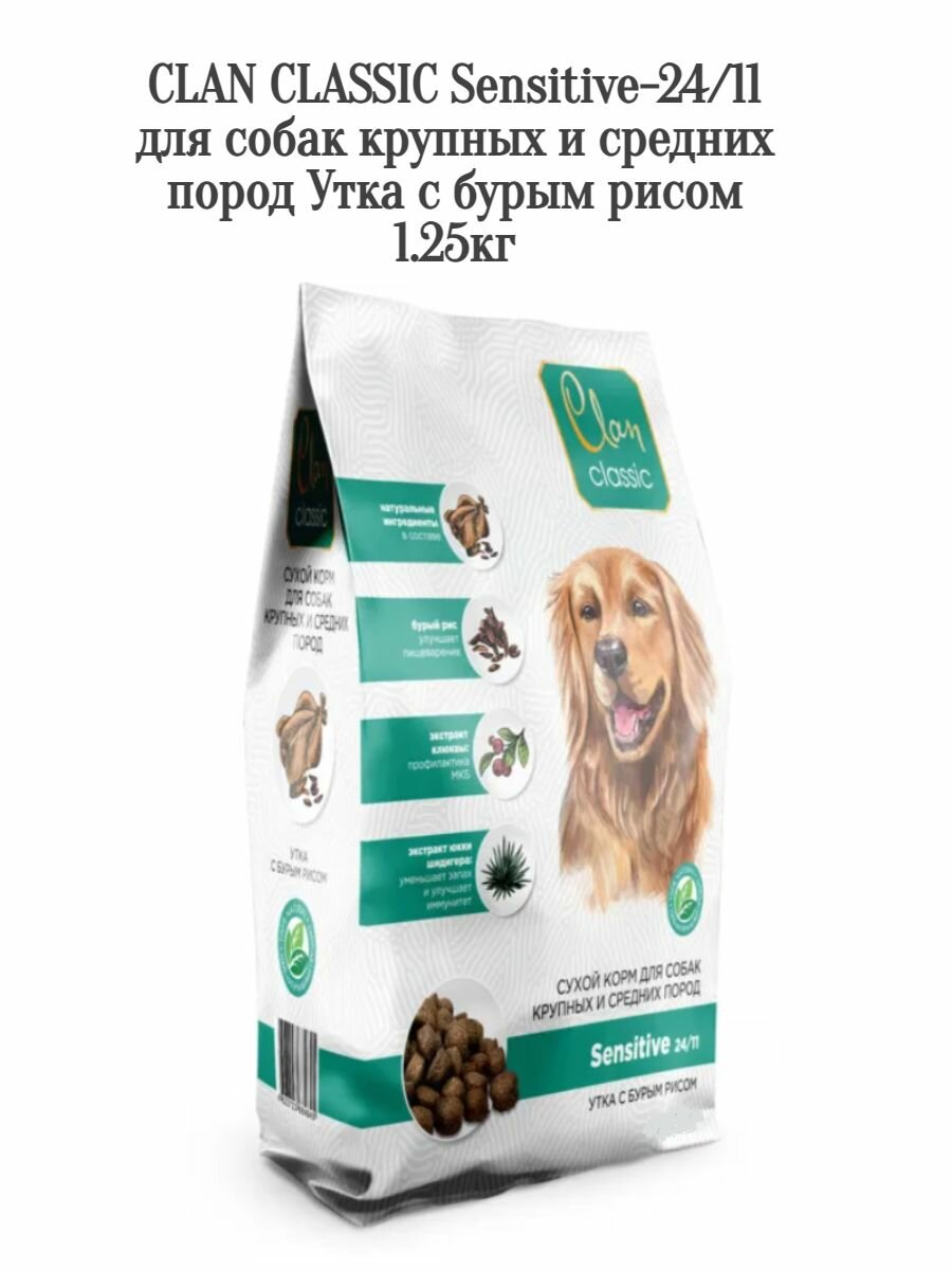 CLAN CLASSIC Sensitive-24/11 для собак крупных и средних пород Утка с бурым рисом 1.25кг: сравнение цен, характеристики, фото, актуальное наличие и цены.