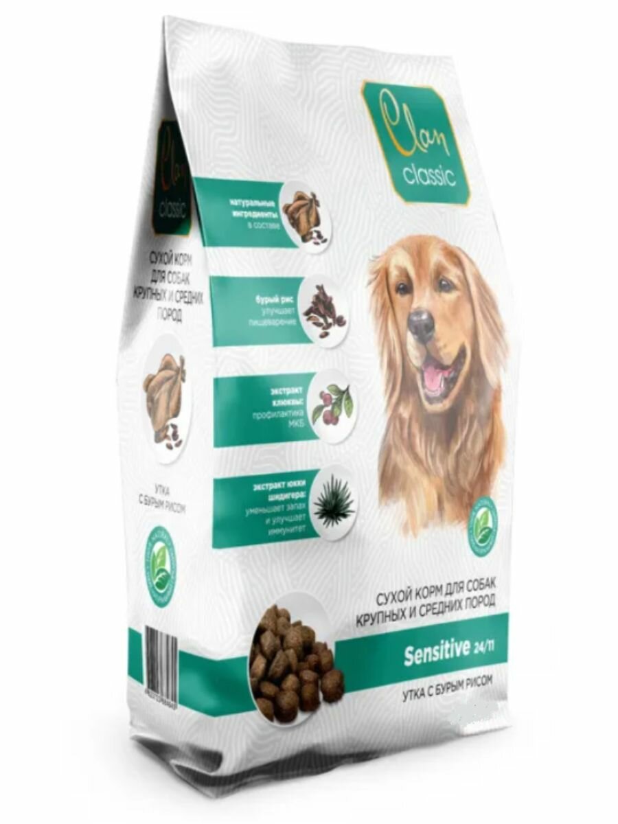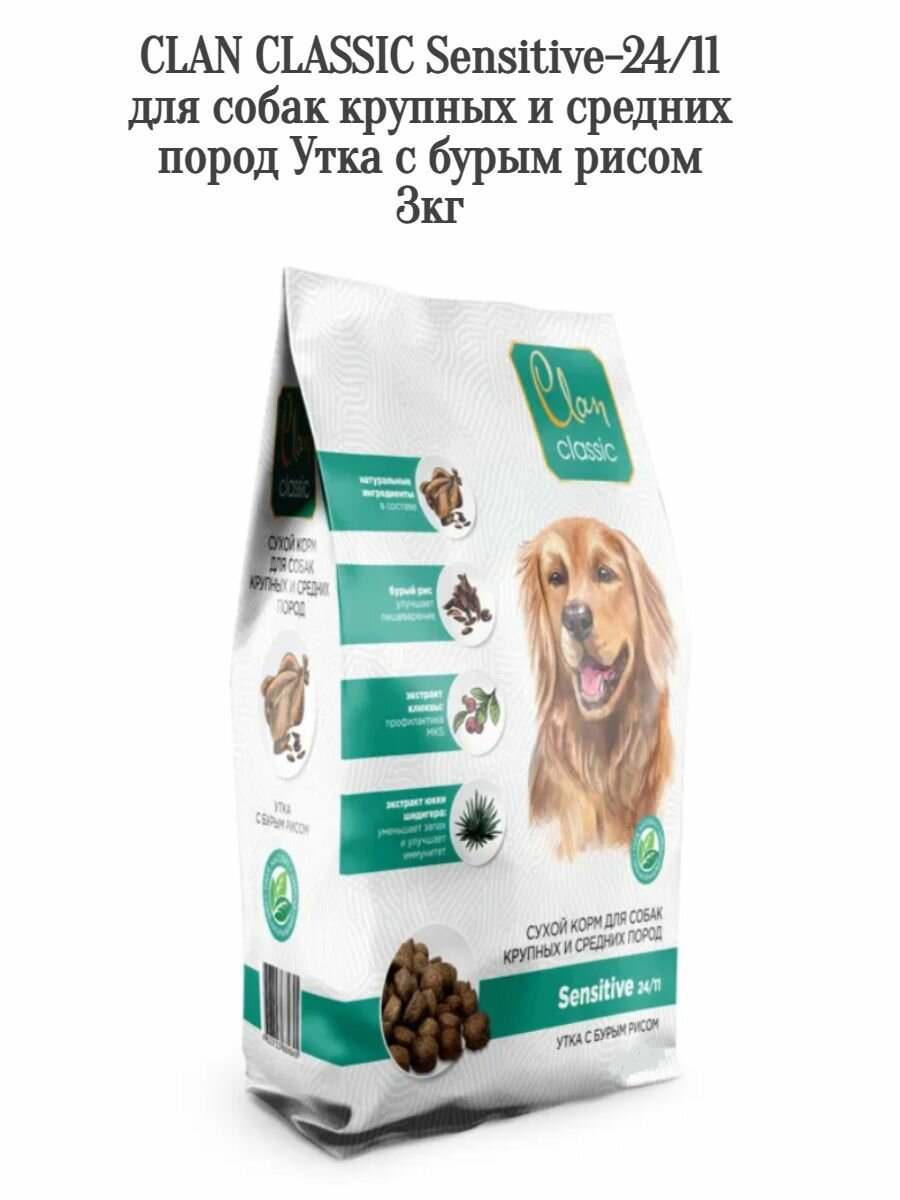 CLAN CLASSIC Sensitive-24/11 для собак крупных и средних пород Утка с бурым рисом 3кг: сравнение цен, характеристики, фото, актуальное наличие и цены.