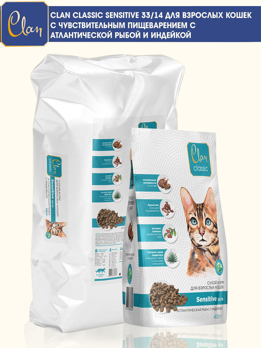 CLAN CLASSIC SENSITIVE 33/14 для взрослых кошек с чувствительным пищеварением с атлантической рыбой и индейкой (0,4 кг х 4 шт): сравнение цен, характеристики, фото, актуальное наличие и цены.