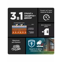 Быстросохнущая пропитка-антисептик на гибридной основе для защиты древесины до 9 лет. Формула 3 в 1. Грунт: обеспечивает равномерное впитывание в древесину; пропитка-антисептик защищает от плесени + образует декоративное финишное покрытие. Гибридное акрил-алкидное связующее образует атмосферостойкое паропроницаемое покрытие, древесина продолжает «дышать». Эластичное тонкое покрытие идеально подходит для обработки бревенчатых фасадов и бань. Вода в качестве растворителя, поэтому пропиткаантисептик имеет нейтральный запах, легко наносится и быстро сохнет. Сохраняет видимой текстуру древесины, полуматовая. Чем более насыщенный цвет пропитки, тем более выражены защитные свойства.
