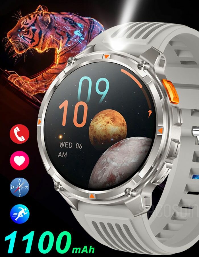 Cмарт часы мужские водонепроницаемые противоударные, с 1.7’большим amoled экраном, Оснащен функциями Bluetooth-звонков, компаса, фонарика и фитнес-трекера.