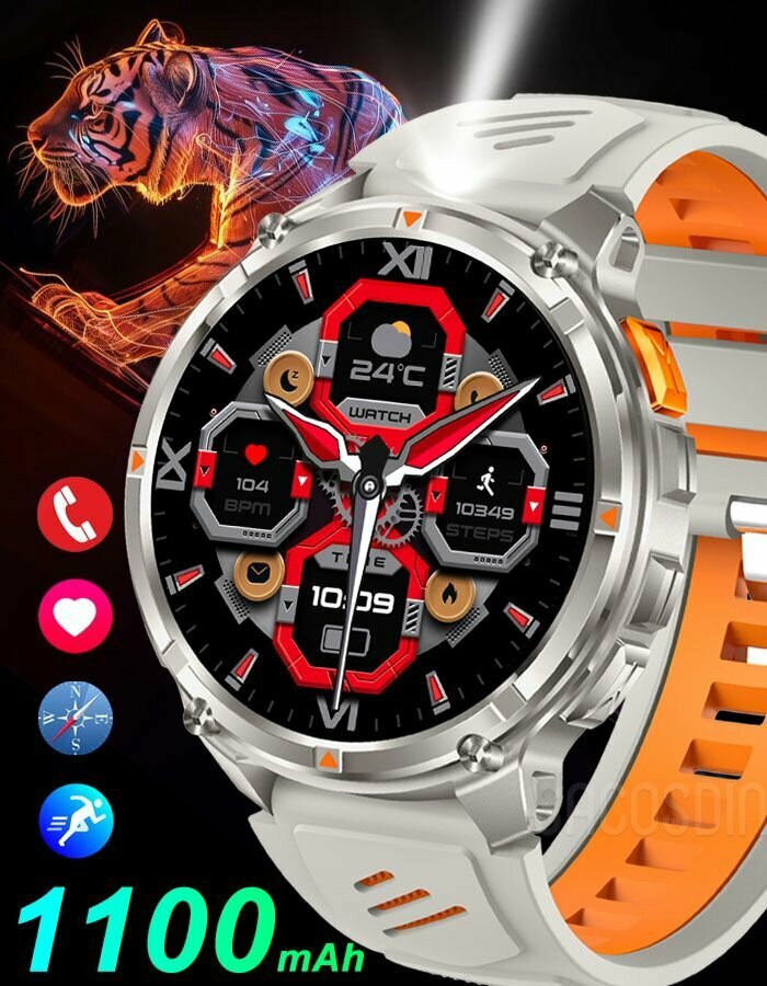 Cмарт часы мужские водонепроницаемые противоударные, с 1.7’большим amoled экраном, Оснащен функциями Bluetooth-звонков, компаса, фонарика и фитнес-трекера.