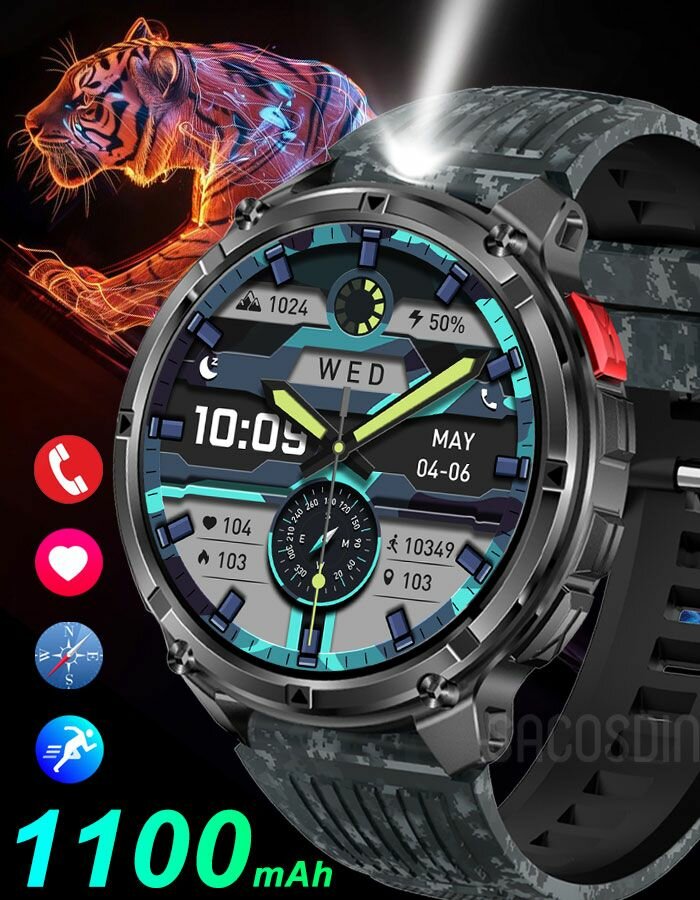 Cмарт часы мужские водонепроницаемые противоударные, с 1.7’большим amoled экраном, Оснащен функциями Bluetooth-звонков, компаса, фонарика и фитнес-трекера.
