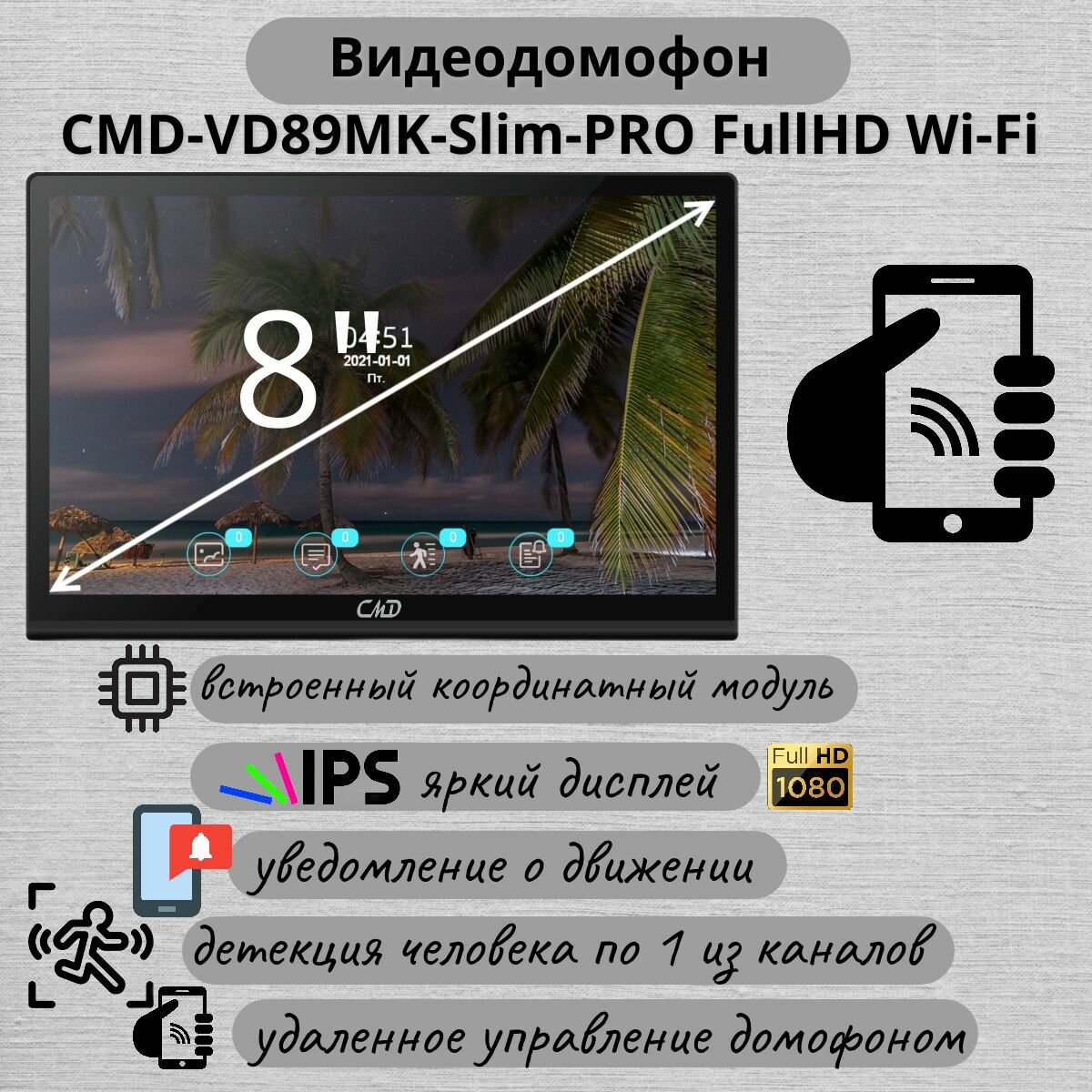 CMD-VD89MK-Slim FullHD Wi-Fi имеет 8 - дюймовый Touch screen/IPS дисплей с разрешением 1024 * 600, с записью видео 1920*1080 (FullHD).