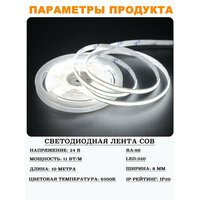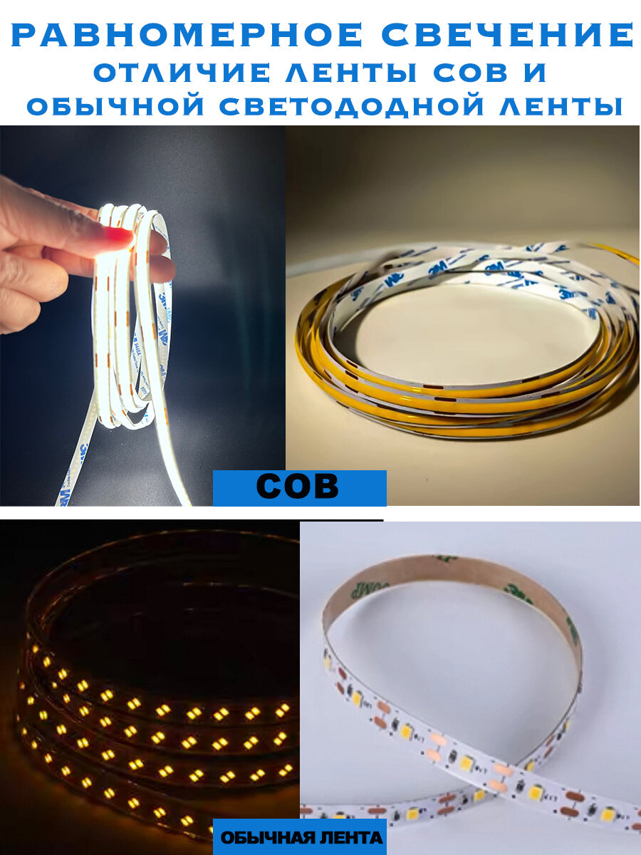 Лента оснащена COB светодиодами, которые обеспечивают высокую светоотдачу и долгий срок службы. Благодаря этому, вы получаете яркое и равномерное освещение, которое не будет утомлять глаза.